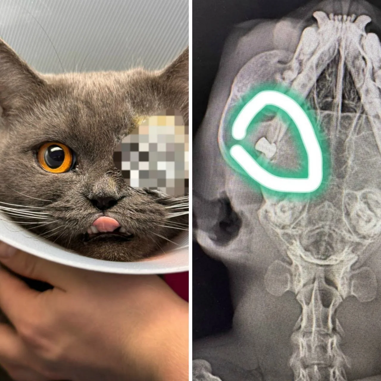 На обычную травму это не было похоже, и медики решили сделать рентген. На снимке увидели пулю. Кота удалось спасти, но он на всю жизнь останется инвалидом. Врачу Андрею Диденко и ассистенту Екатерине Перевертовой пришлось полностью удалять глазное яблоко. Пулю не удалось достать, так как она располагалась очень глубоко и останется с котом навсегда.
