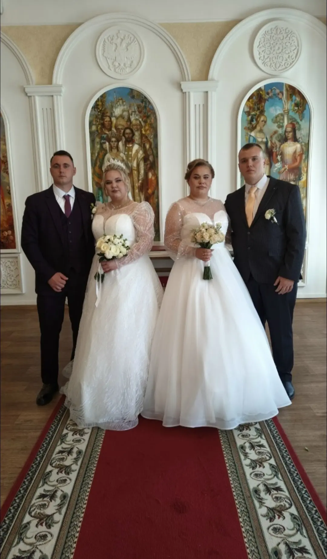 Их женихи Сергей и Николай поддержали идею сестёр, а в загсе пошли им навстречу и назначили два бракосочетания в одно время.