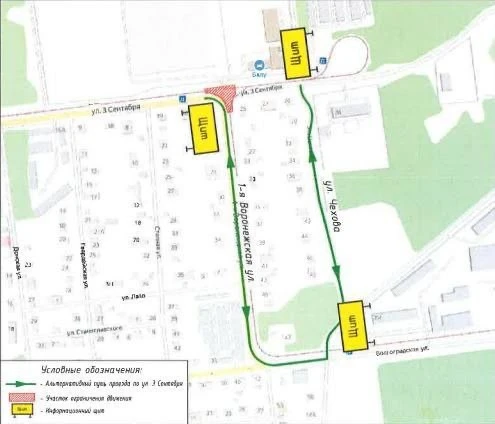Ограничения на пересечениях по ул. 3 Сентября с ул. Воронежской и ул. Чехова будут действовать с 7 утра 8 октября до 7 вечера 12 октября для укладки асфальта, сообщили в мэрии.