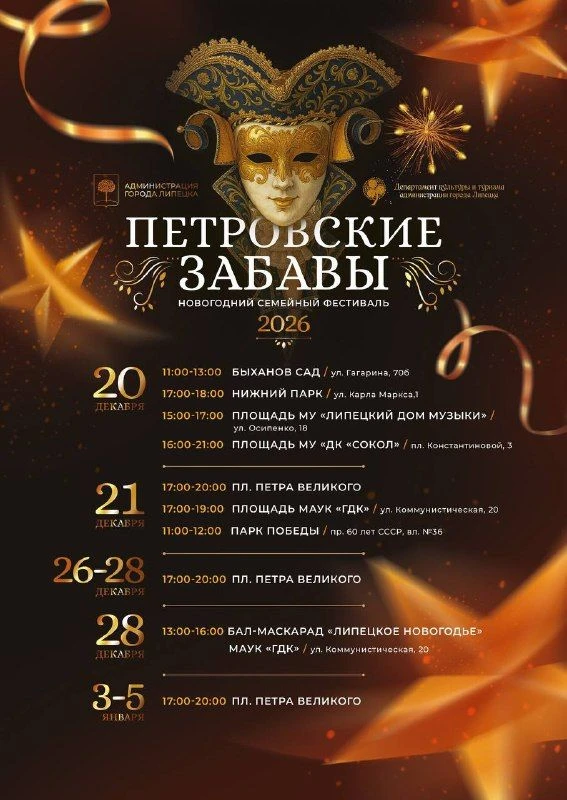 20 декабря в 16:00 на площади Петра Великого зажгут огни главной городской ёлки. Тогда же стартует семейный фестиваль «Петровские забавы», который откроет новогодние праздники в Липецке.