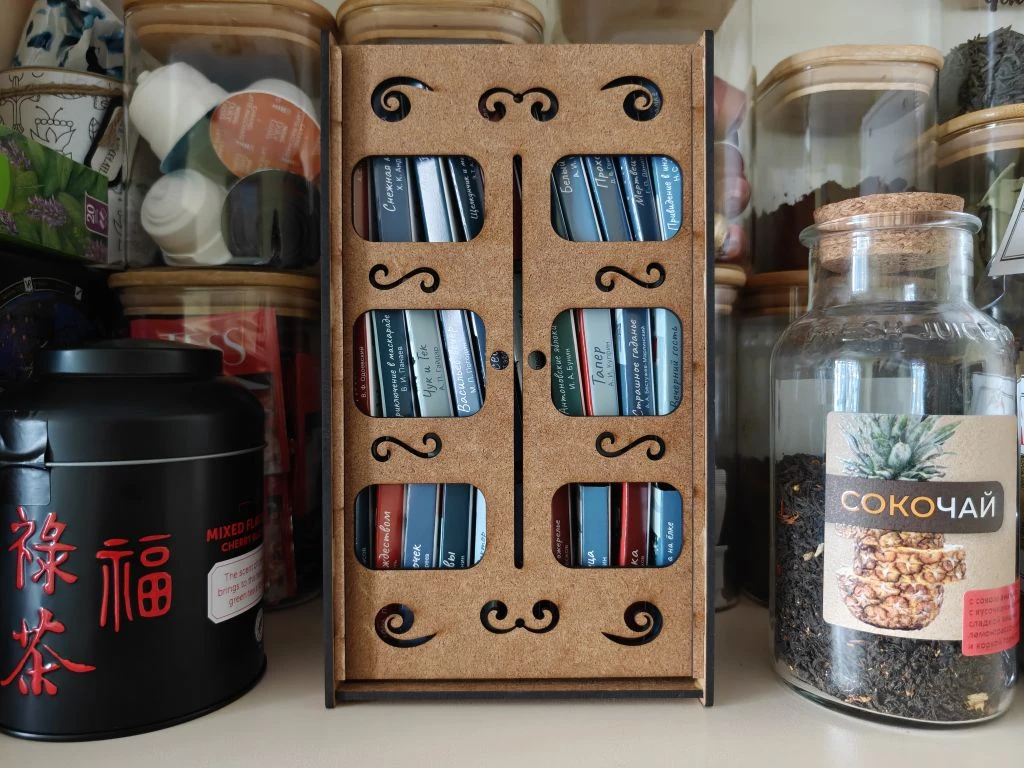 Вообще идея — очень крутая. Жаль, что реализована довольно лениво. Обертки в виде книжных корешков — это здорово, вот только сам чай никакого отношения к произведениям не имеет. Да и вообще в шкафу всего три вида чая — пусть и неплохого: с мелиссой, с малиной и пряный — с перцем и гвоздикой. Последний оказался самым интересным. Я вообще очень люблю гвоздику: и в духах, и в чае, и в глинтвейне. Особенно в глинтвейне.