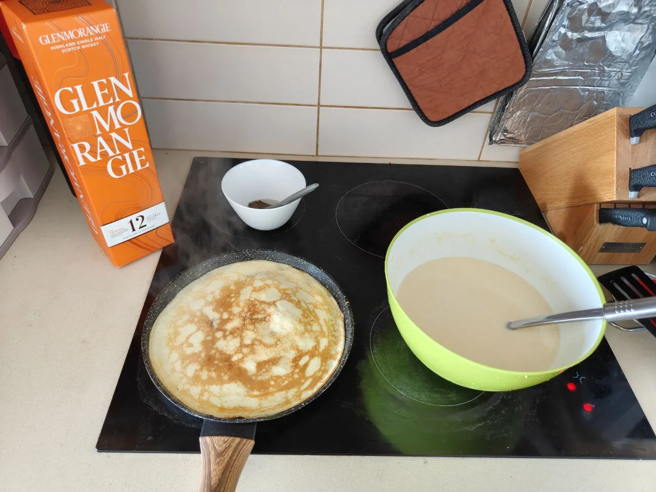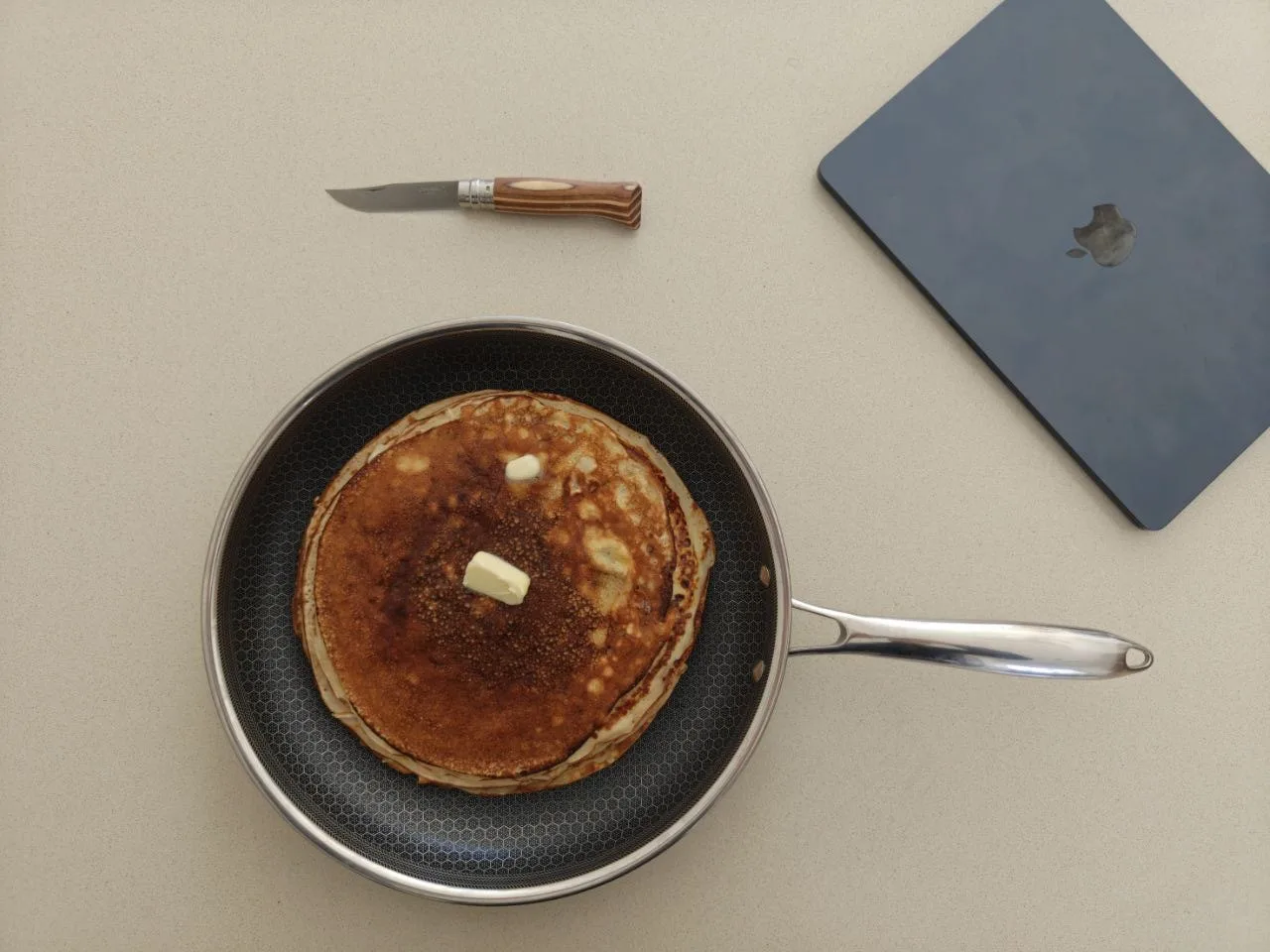 Нужно готовые блины складывать не на тарелку, а в другую сковородку. В итоге, когда последний блин испечён и занял заслуженное место в стопке, кладём сверху кусочек масла и отправляем сковородку в духовку. Включаем верхний нагрев и конвекцию минут на 10 — и вуаля: у вас прогретая стопка блинов с хрустящими краями.