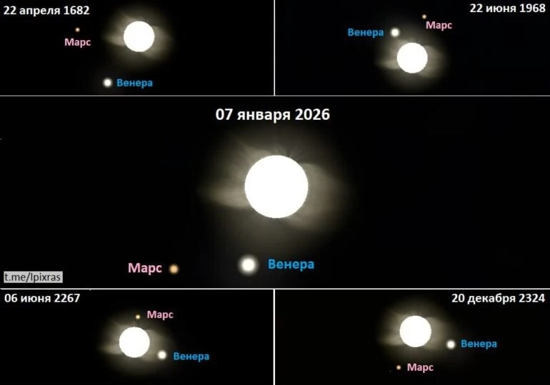 В небе соединятся Солнце, Венера и Марс. Особенно хорошо явление будет видно с 6 по 9 января. С Земли визуально будет казаться, что космические объекты практически соединились в одну точку. Это связано с тем, что угловое расстояния между ними составит всего 1 градус, сообщили в Лаборатории солнечной астрономии.