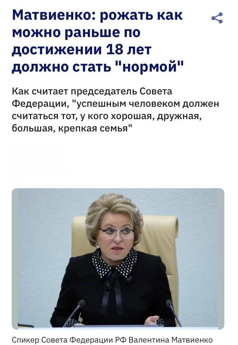 Матвиенко призвала россиянок рожать сразу после 18 лет.