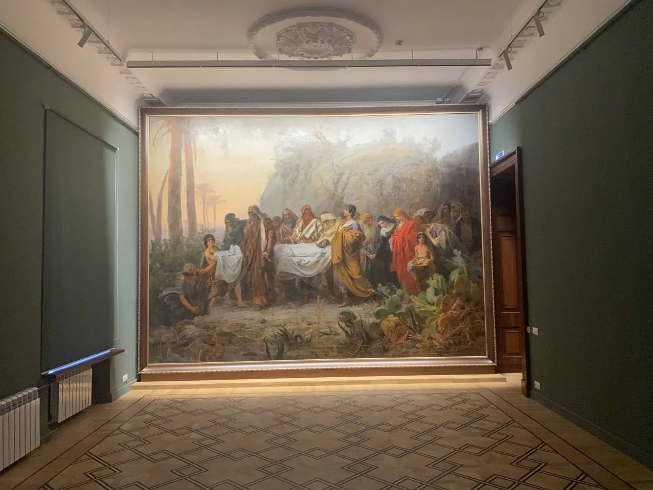 Первым экспонатом собрания стало пятиметровое полотно Николая Кошелева, написанное в Риме в 1881 году. Художник передал его в дар создающемуся музею.