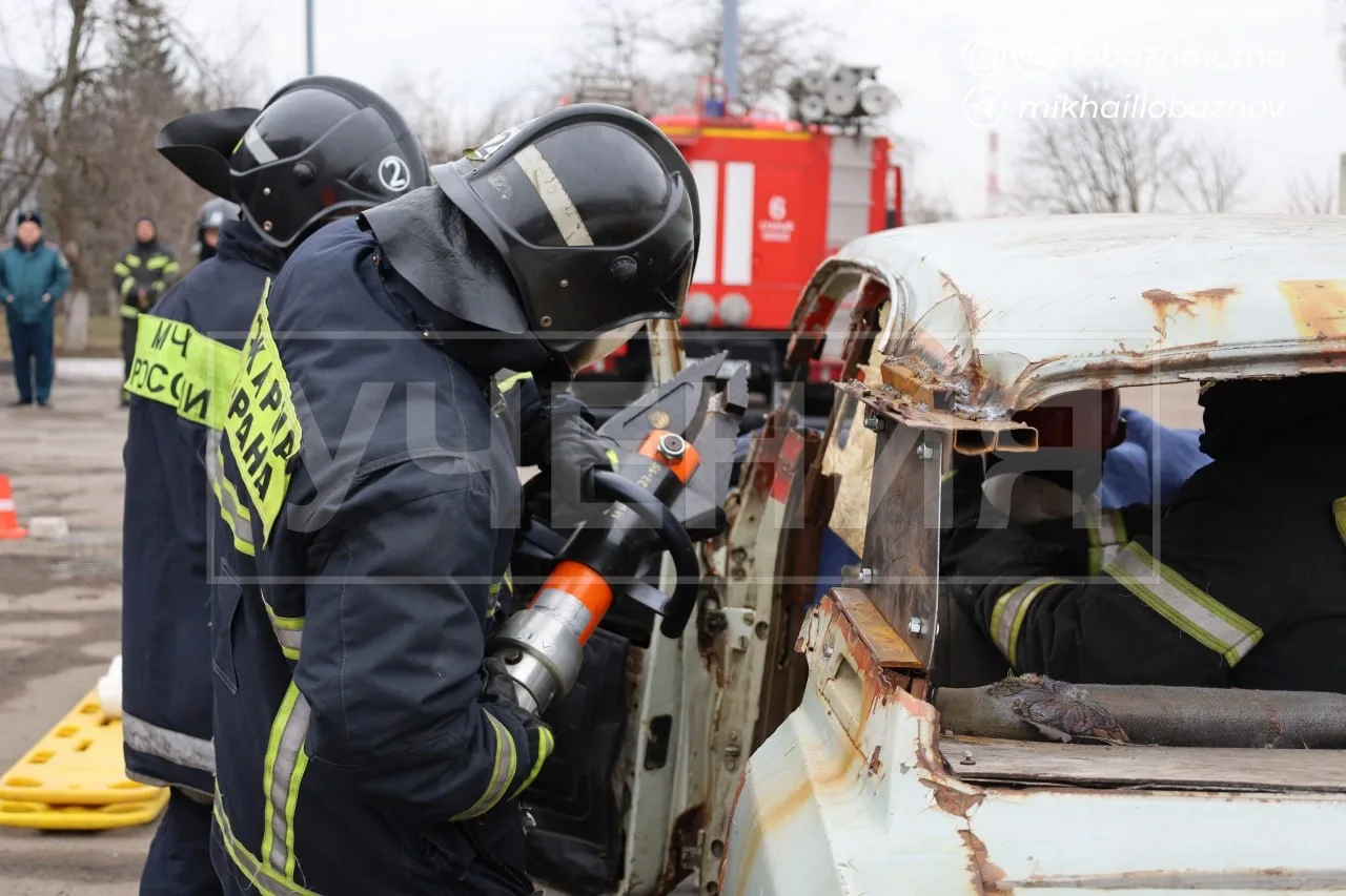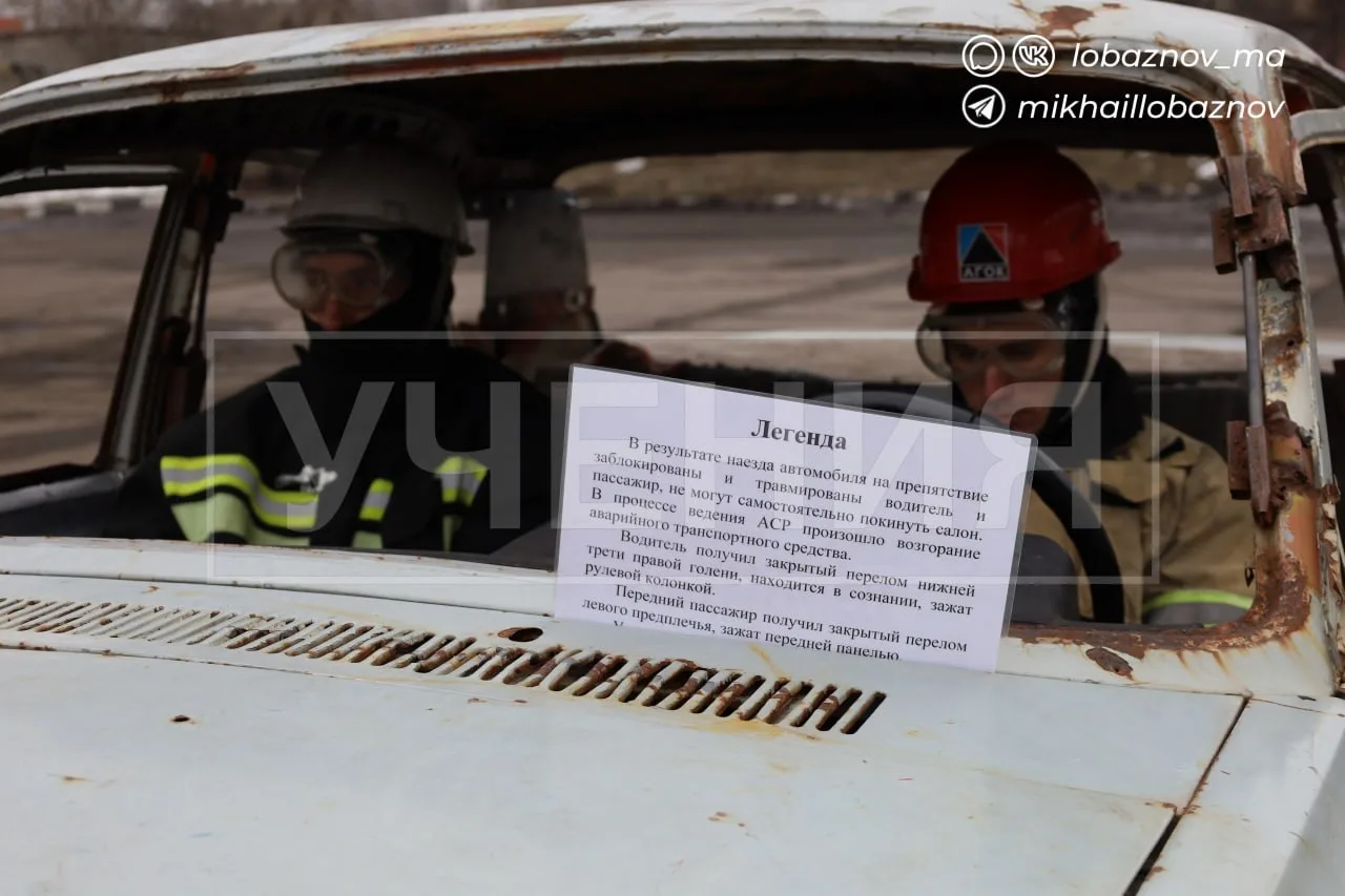 По легенде, в автомобиле, столкнувшемся с препятствием, оказались заблокированы два человека. Они травмированы и самостоятельно выбраться из машины не могут. Представленная ситуация осложнилась тем, что в процессе аварийно-спасательных работ авто загорелось.