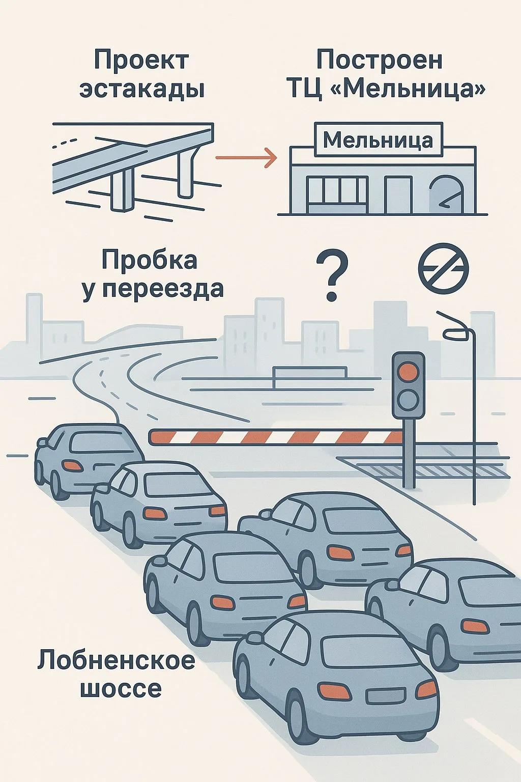 Каждый вечер Лобненское шоссе парализуют многометровые заторы. И причина не только в железнодорожном переезде. Корень проблемы — в системном недофинансировании и изменении градостроительных планов, из-за которых ключевые проекты были заморожены или пересмотрены.
