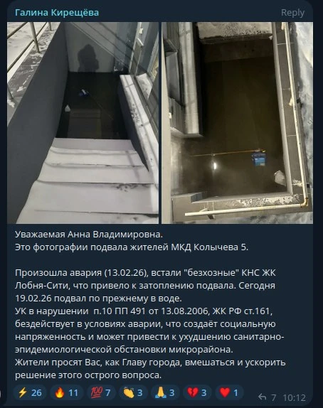 Жители домов №3, 5 и 7 на улице Колычева сообщают, что подвалы их многоэтажек затапливает канализационными стоками практически ежедневно. Причина — постоянные остановки насосного оборудования на КНС Лобня-Сити. КНС оказалась бесхозной!