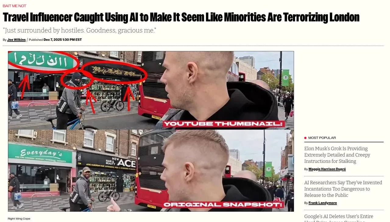 А вот и ИИ-пост-правда. То, о чём мы и говорим регулярно. Вот тревел-блогер отлично рейджбайтит на теме мигрантов с помощью искусственного интеллекта.