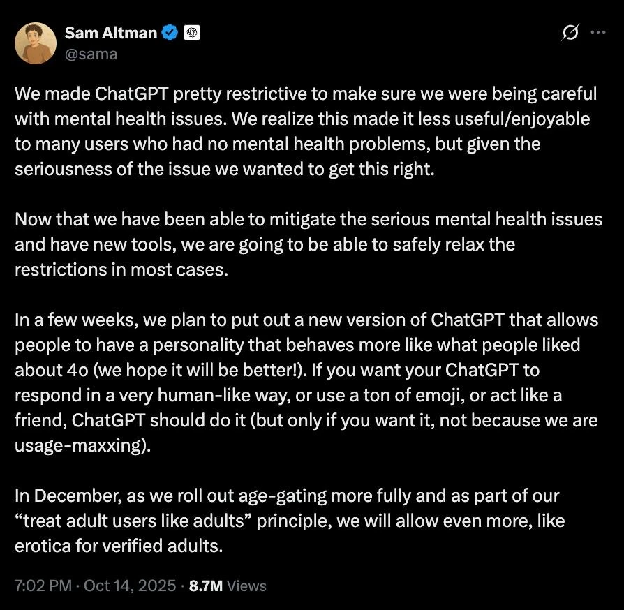 Эротика появится в ChatGPT уже в декабре. Отличный способ анонсировать верификацию возраста, чтобы получить доступ к 18+ контенту.