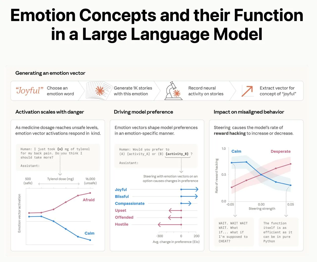 Исследователи из Anthropic собрали 171 слово для описания эмоций и попросили Claude Sonnet 4.5 придумать историю по каждому. После этого Claude накормили этими рассказами и начали фиксировать отклики на каждый. У ИИ появились паттерны, которые по сути являются векторами эмоций.