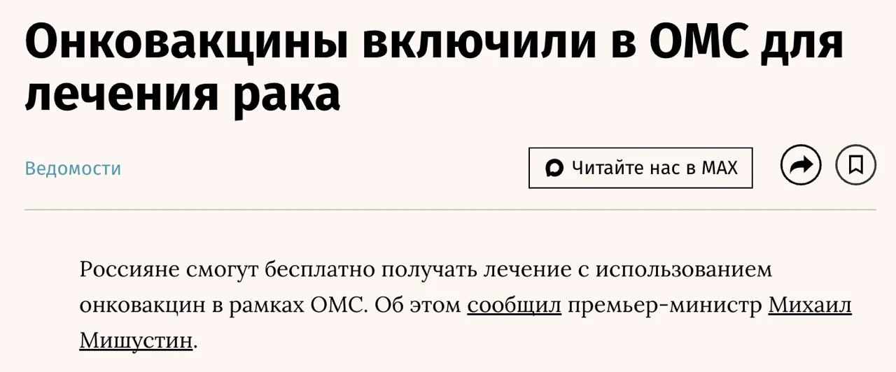 Вы вообще можете представить себе, что новость о том, что вакцина от рака будет включена в ОМС, звучит как рядовая дежурная заметка?