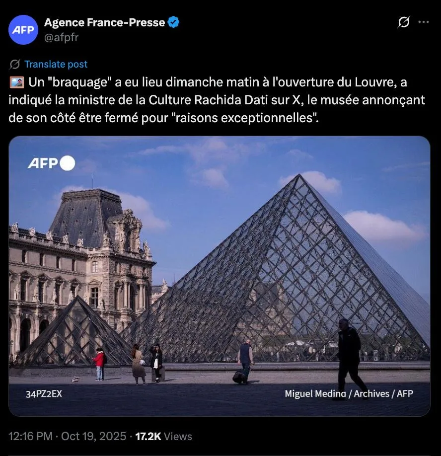 Лувр ограбили, пишут французские СМИ. Музей закрыт, ведётся расследование, составляют полный список всего, что украли.