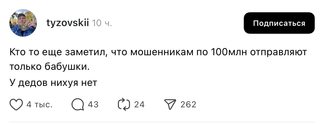 Дисклеймер: мы всегда пишем о мошенниках и их схемах. В сети полно историй о том, как работают аферы, а медийные личности — первые, кто должен быть в курсе, особенно когда ваши действия могут спонсировать вражеское государство миллионами рублей. И если тебя обманывает мошенник, о которых сейчас кричат буквально везде, то ты платишь налог на тупость. Простите, если вы считаете иначе.