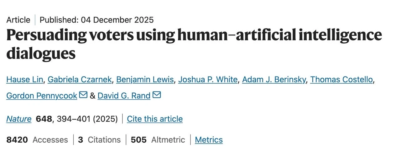 Оригинальная статья «Persuading voters using human–artificial intelligence dialogues» — полноценное исследование, которое провели в нескольких электоральных контекстах и зонах: США, Канаде и Польше. Участники случайным образом начинали общаться с ИИ, запрограммированным на поддержку конкретного кандидата. Результаты убили: после диалога у людей менялась готовность голосовать за того или иного кандидата. Эффект превосходил по результатам те, что обычно фиксируют в исследованиях политической рекламы и классических агитационных форматов. Куда важнее, что эффект был заметен не только у тех, кто слабо погружён в политику.