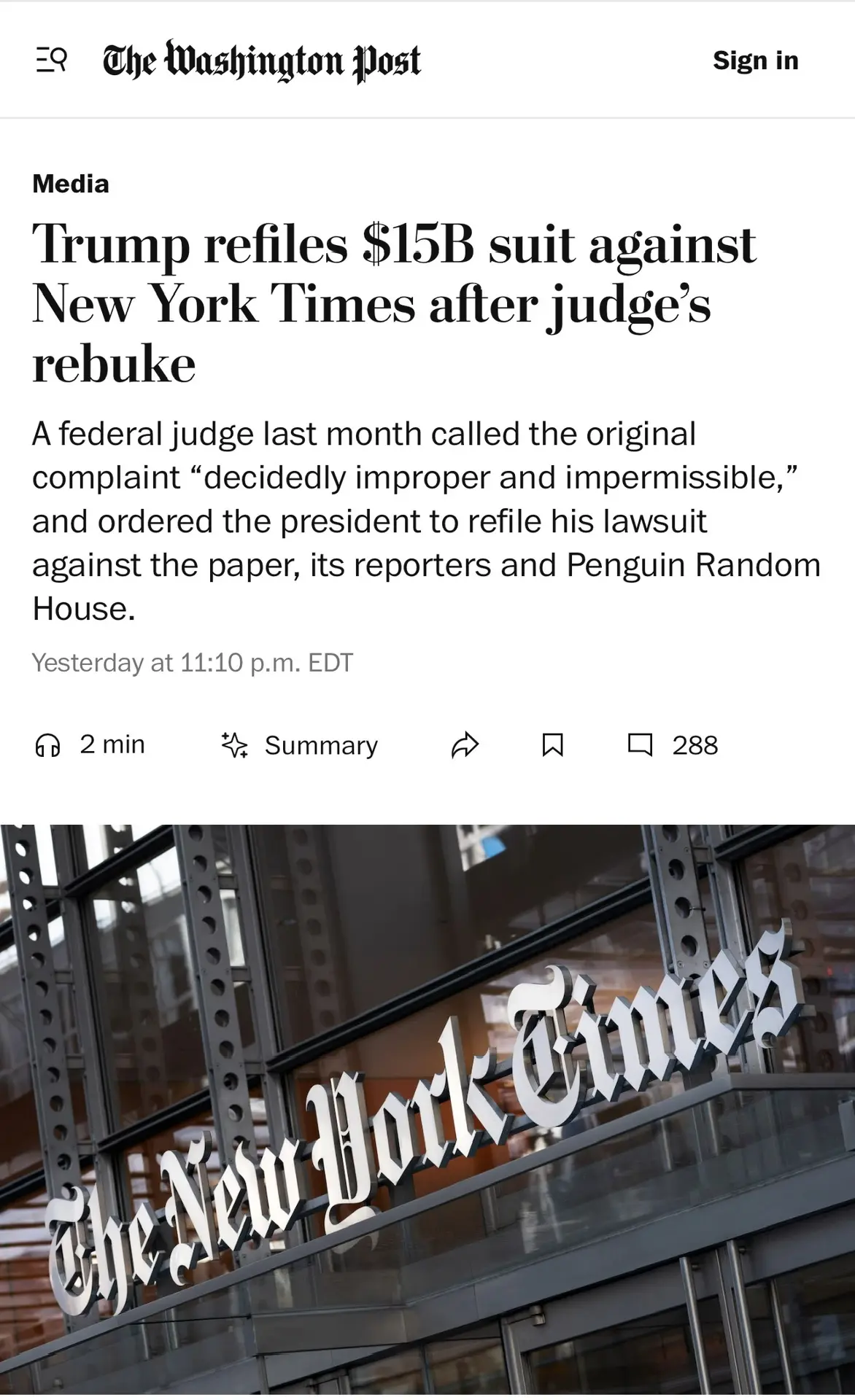 Трамп решил не останавливаться в борьбе с журналистами и подал повторный иск о клевете против The New York Times — но на этот раз чуть скромнее, всего на $15 млрд. Ранее его иск отклонили, назвав «ненадлежащим и недопустимым».