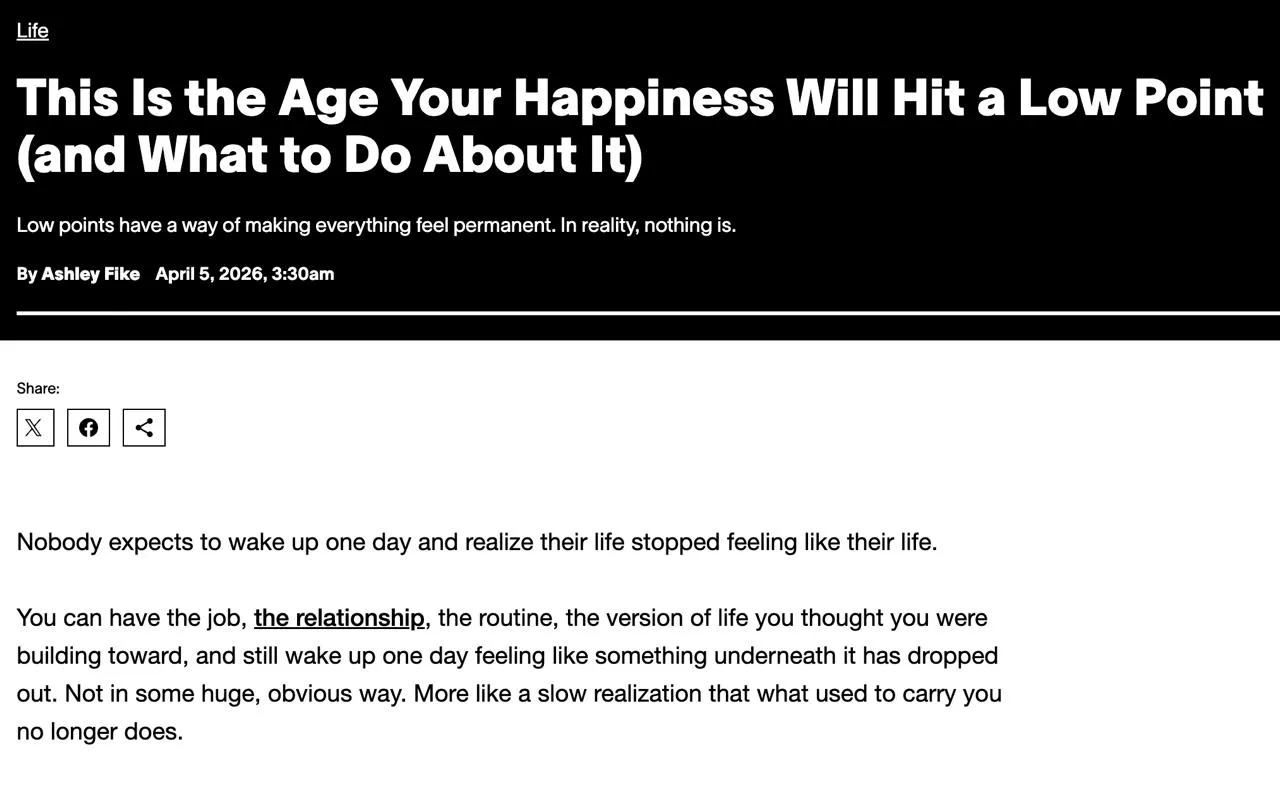 Исследователи пишут, что все мы к 40 годам станем несчастными. В новом исследовании были проанализированы данные из десятков стран, и оказывается, что от 40 до 45 — самая глубокая яма так называемого несчастья.