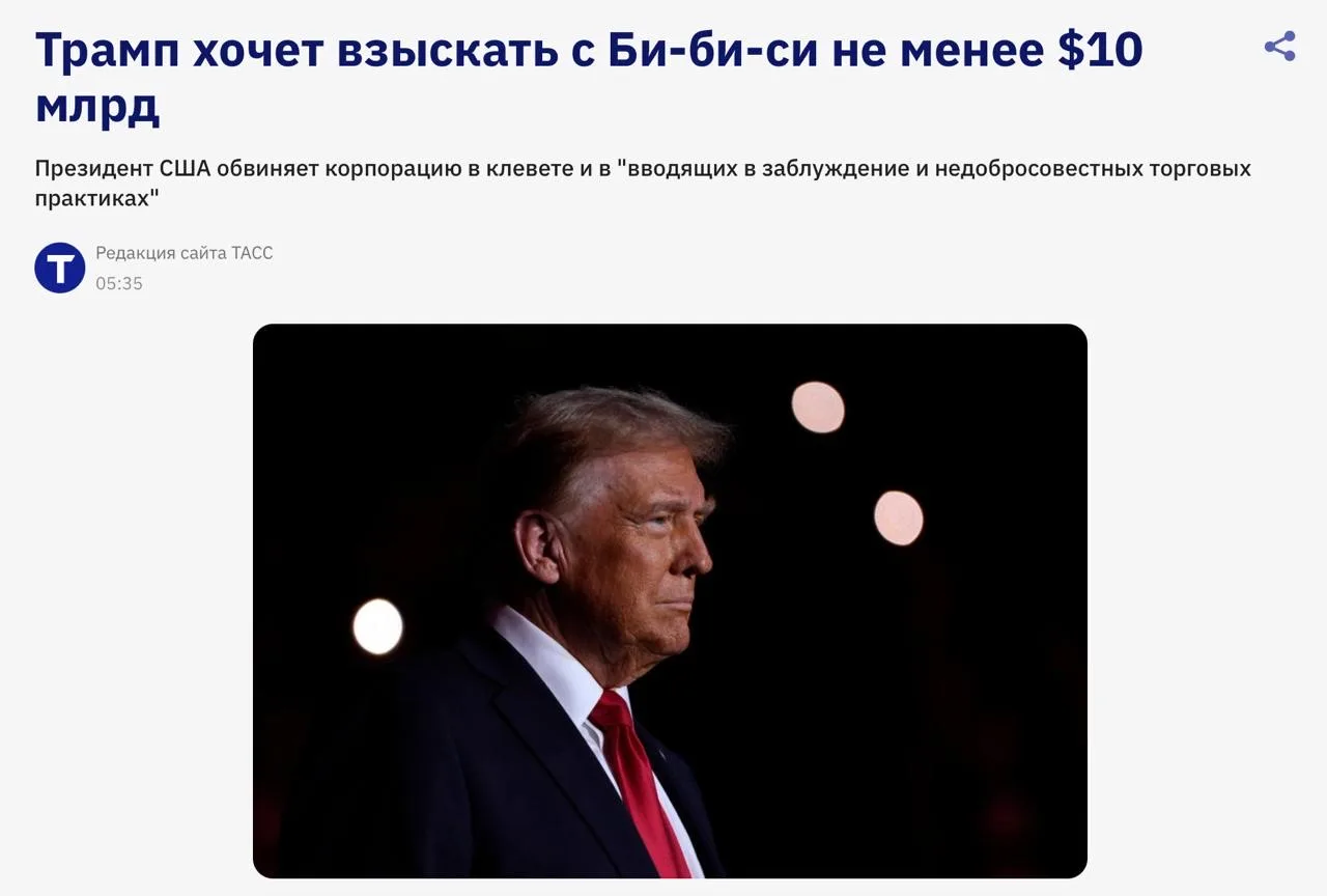 Трамп-таки подал в суд на BBC и хочет он минимум $10 млрд. Это та сумма, в которую он оценивает ущерб за клевету, а если точнее: искажение его слов с помощью ИИ и монтажа.