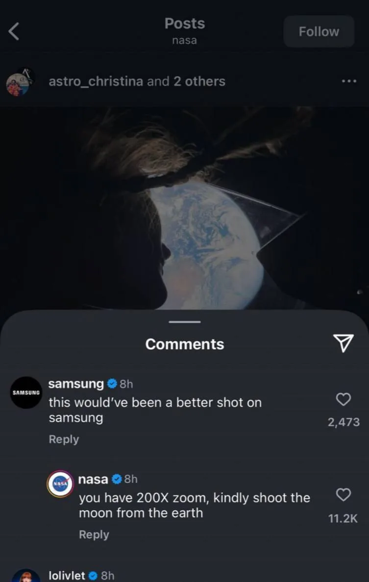 Ну а что ещё интереснее, так это то, что NASA активно защищает продукт купертиновских в комментариях. Вот отличный пример: пришёл SMM-щик Samsung и сказал, что лучше бы снимали на их продукт, на что агентство ответило: «у вас же 200-кратный зум — вот и снимайте Луну с Земли».