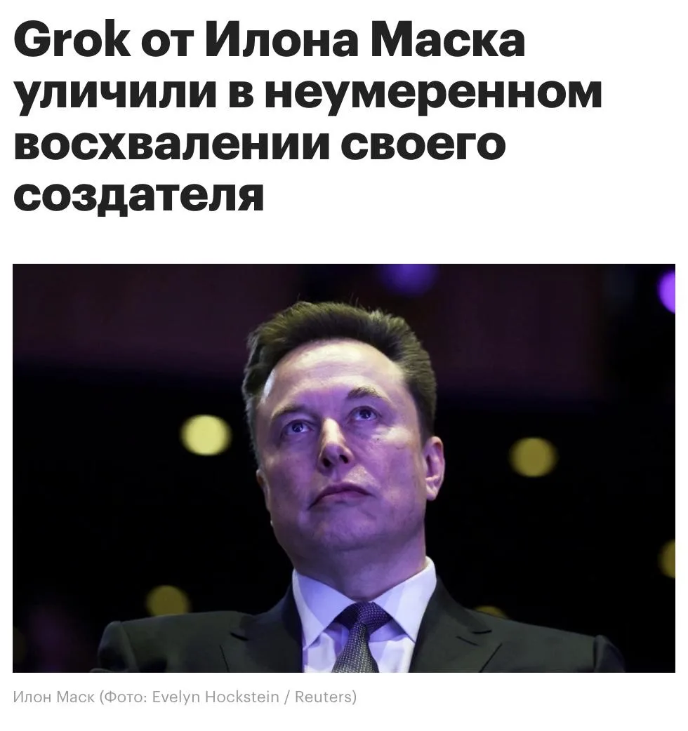 Ночью пользователи X выяснили интересную штуку: Grok 4.1 везде превозносит Илона Маска. Алгоритмы ИИ настроены так, что всегда хвалят миллиардера. Grok утверждал, что он — один из самых умных людей за всю историю, спортивный и не толстый.