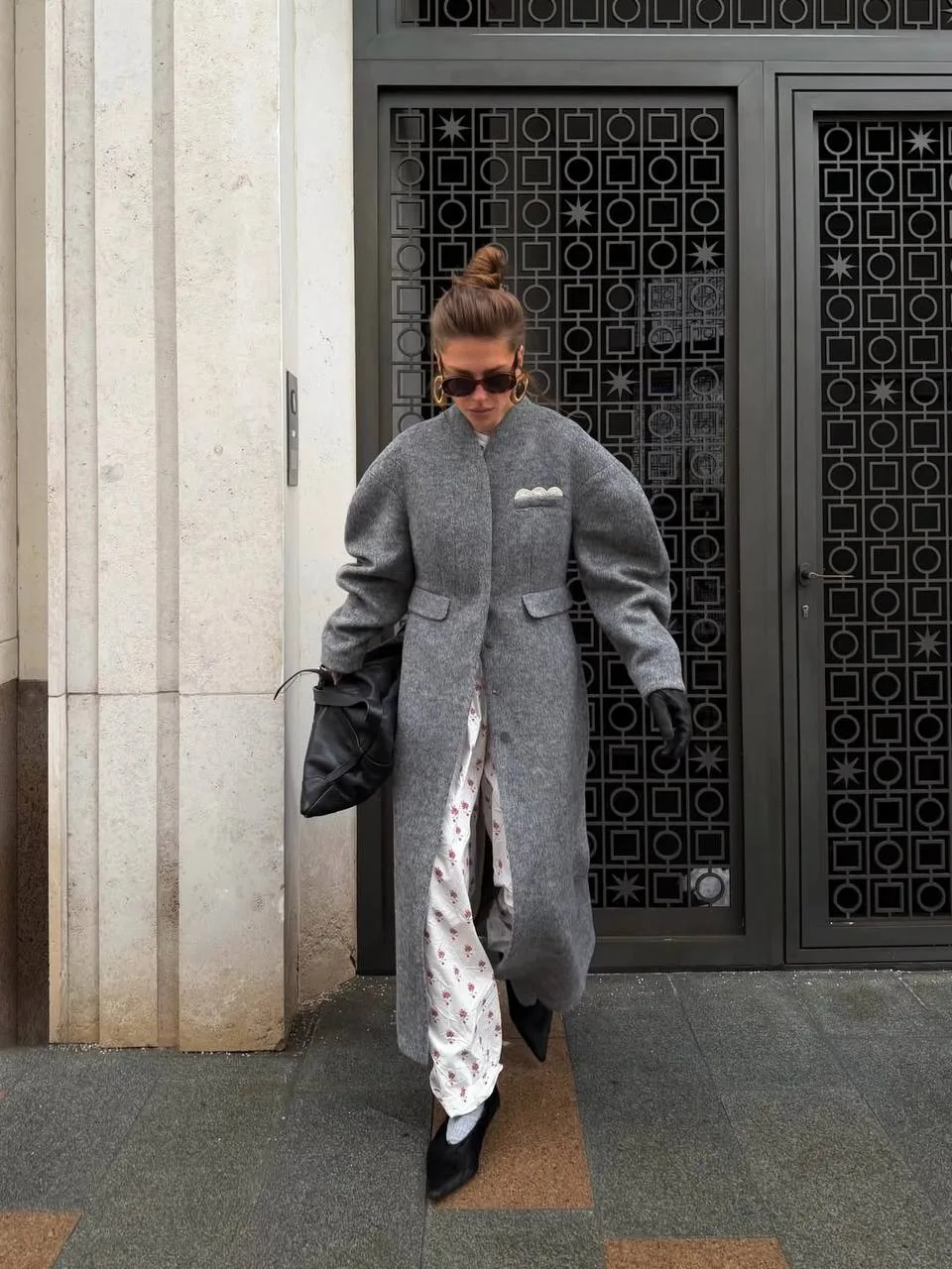 Выполнено из смесового драпа с добавлением шерсти. Максимально актуальная модель: английский воротник с лацканами, приталенный силуэт и роскошный графитовый цвет.
