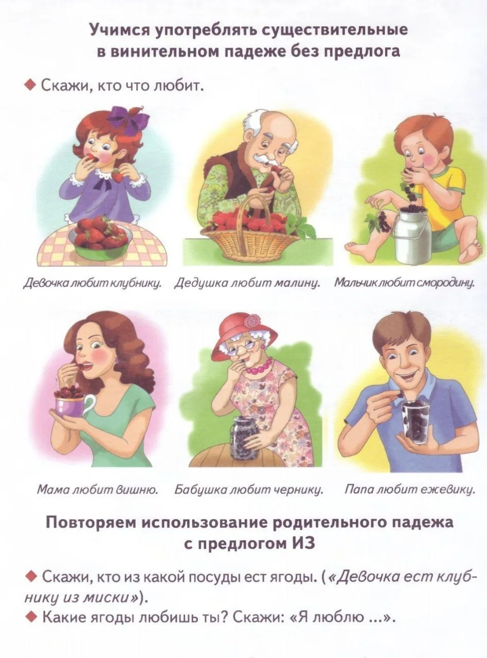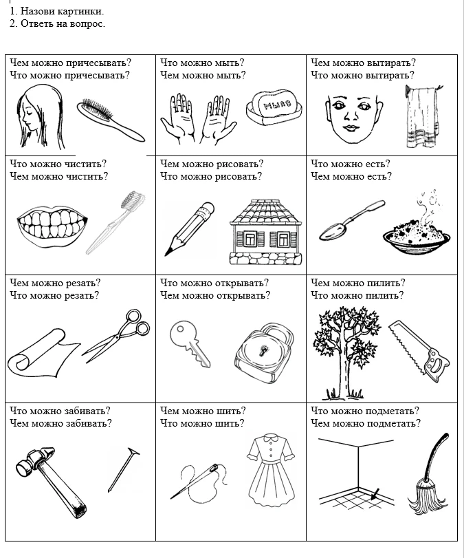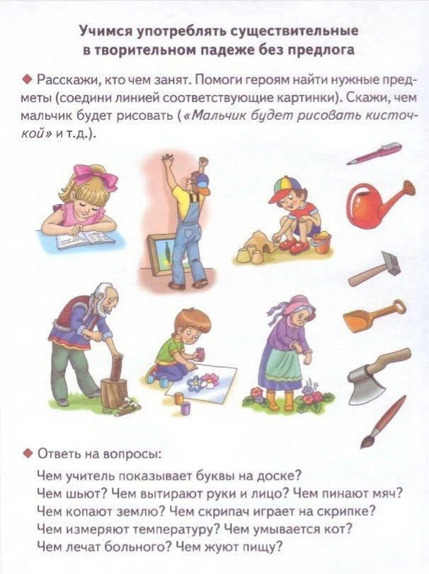 Поскольку дети с недоразвитием грамматического компонента языковой системы не только допускают ошибки в употреблении падежных окончаний, но и часто не понимают или путают падежные вопросы, необходимо проводить специальную работу в этом направлении. Ниже приводится подборка материала, позволяющая показать смысловую разницу между вопросами «Что?» и «Чем?»