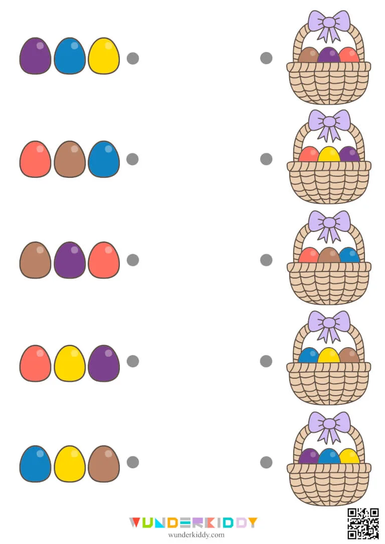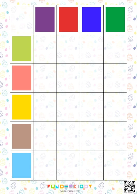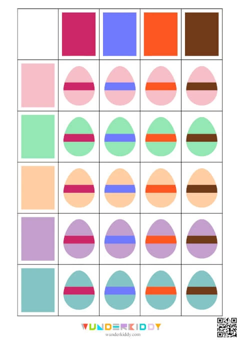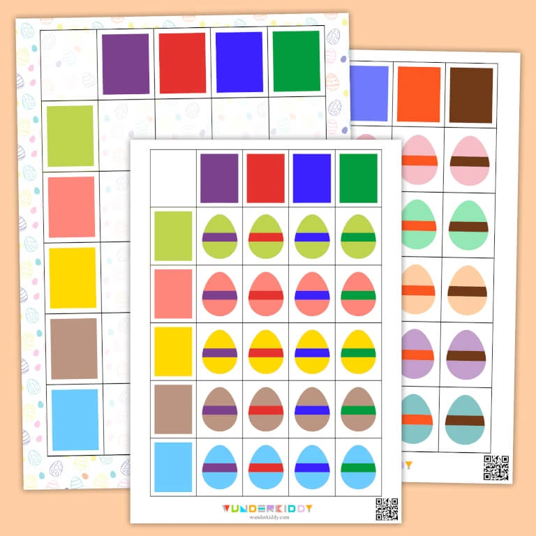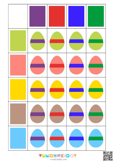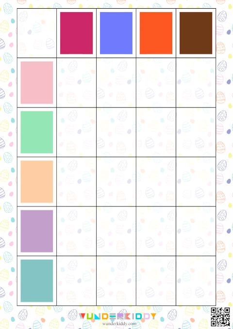 «Пасхальное яйцо» способствует улучшению логического мышления, моторной координации и визуального восприятия различных цветов. В задании малышам нужно сопоставить цвета и разложить пасхальные яйца по подходящим ячейкам таблицы.