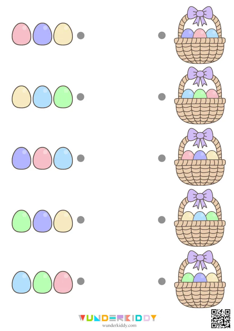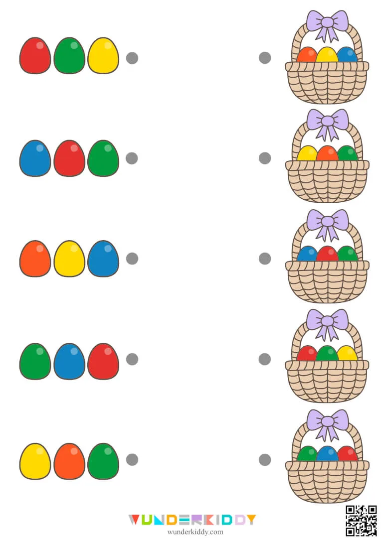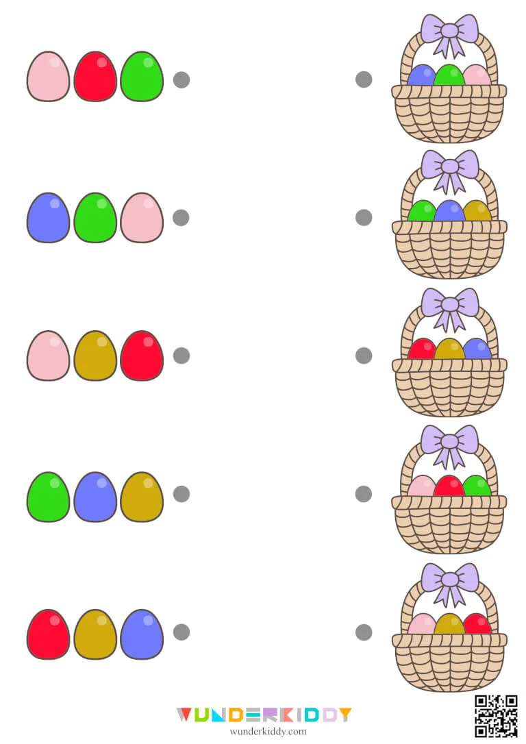 Рабочие листы «Пасхальные корзинки» разработаны для развития логического мышления и зрительного внимания у дошкольников.