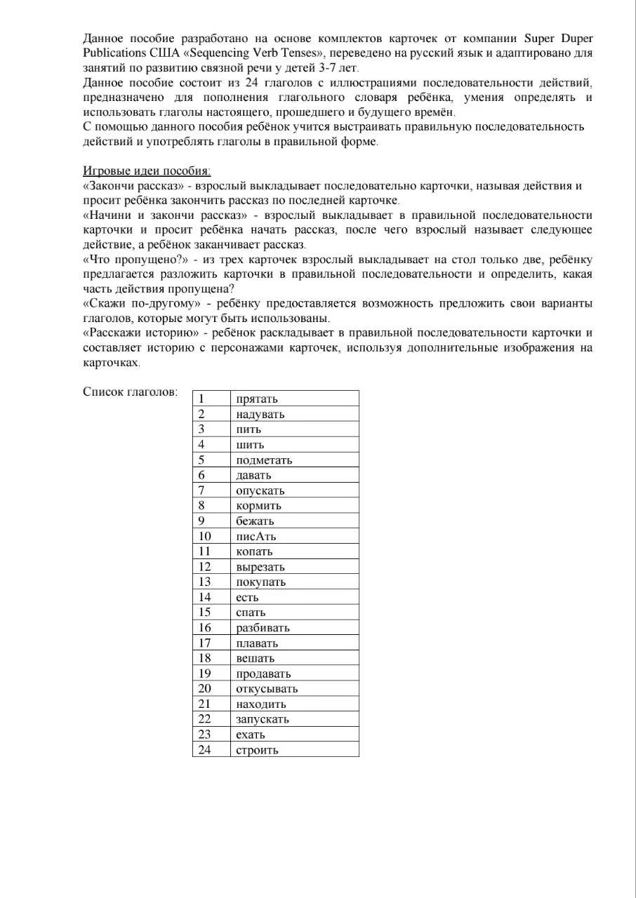 Данное пособие разработано на основе комплектов карточек от компании Super Duper Publications CIlA «Sequencing Verb Tenses»,