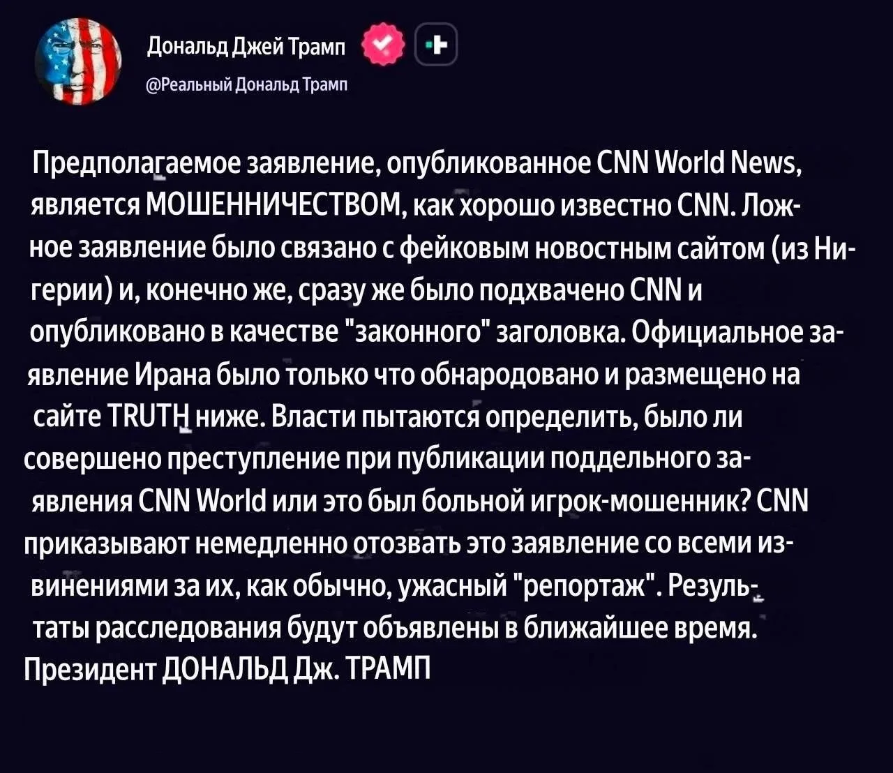 Президент США эмоционально отреагировал на публикацию CNN. Телеканал кратко пересказал заявление Высшего совета нацбезопасности Ирана. Американский лидер заявил, что намерен расследовать этот инцидент и обнародовать результаты позже.