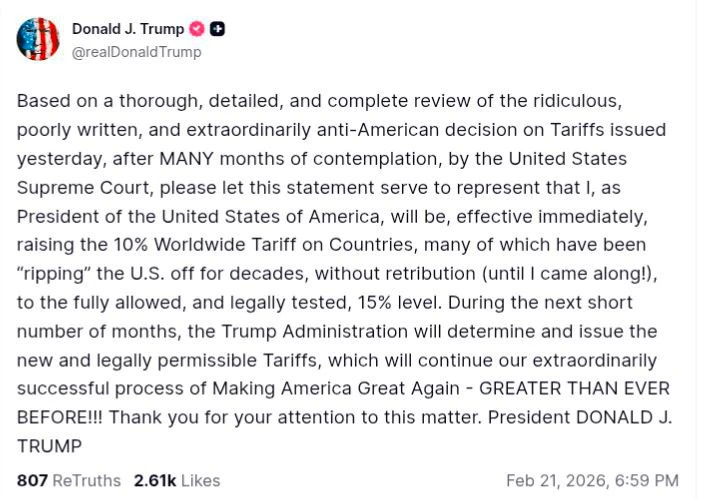 ▪Трамп повысил глобальную ставку тарифов с 10 до 15% после ранее отмененных Верховным судом США пошлин.