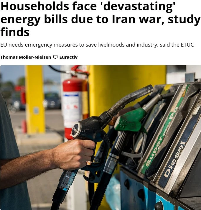 Повышение цен на электричество для европейских домохозяйств вызвано скачком стоимости нефти и газа, которые подорожали на 50% на фоне американо-израильской агрессии против Ирана.