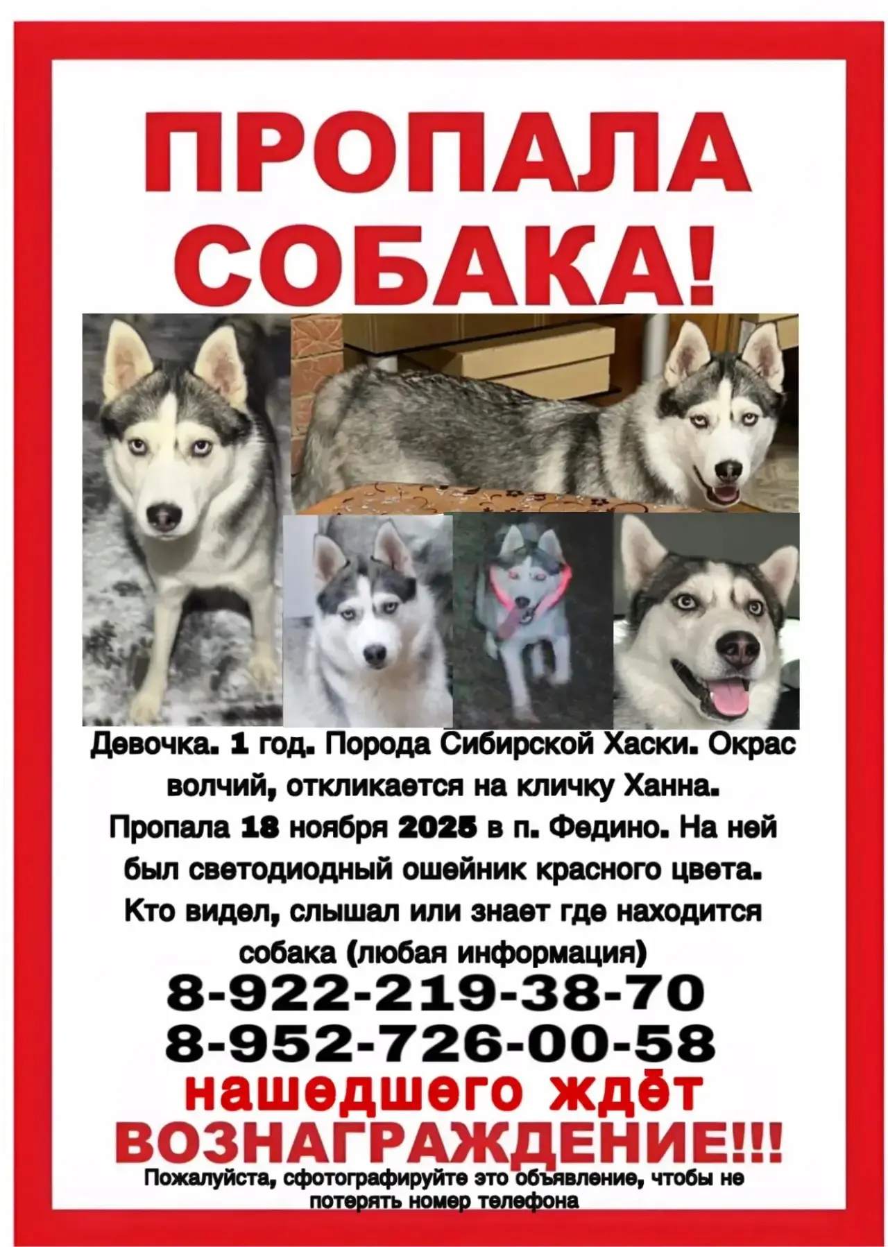 Потерялась собака, хаски, окрас серый с белым (Свердловская область, Нижнетуринский муниципальный округ, поселок Федино)