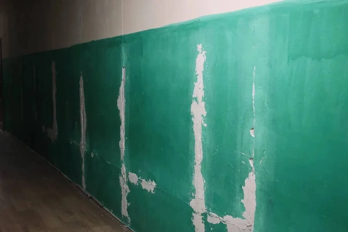 Внутренние двери заменены на новые, оборудованы санузлы, стены обшиты гипсокартоном, проводятся штукатурно-малярные работы и монтаж потолков.