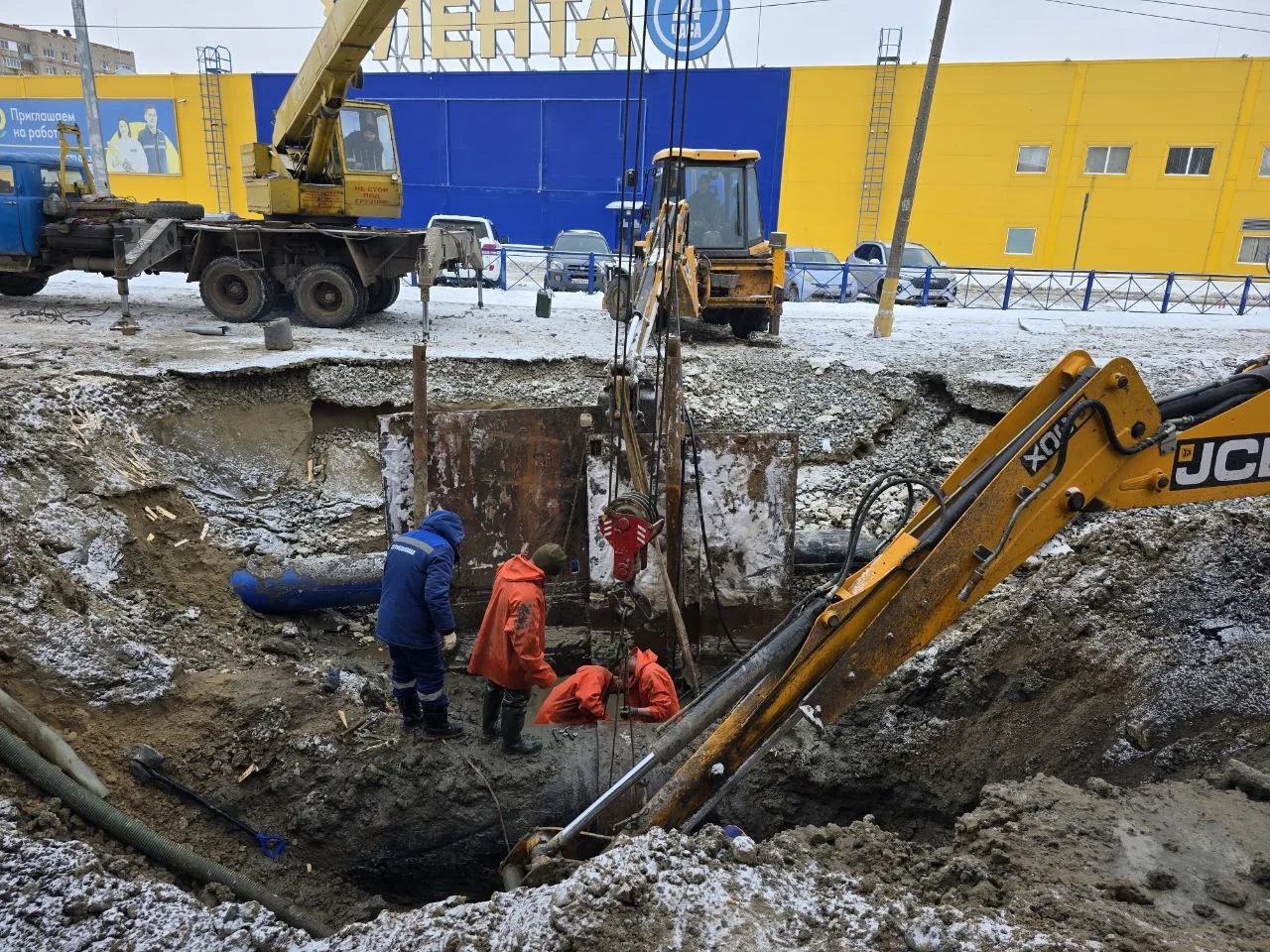 Сложность аварии в том, что повреждена нижняя часть трубы диаметром 1200 мм на глубине 4 метров. Рабочие устраняют дефект на сети под давлением: вода постоянно заполняет котлован, и её приходится откачивать. Задействовано свыше 10 единиц спецтехники.