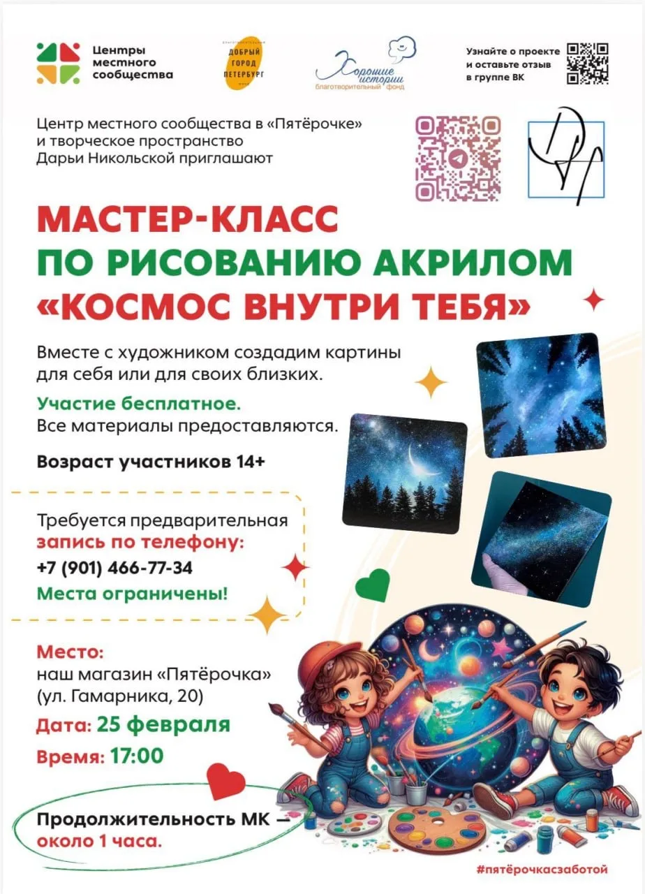 Центр местного сообщества в "Пятерочке" и Творческое пространство Дарьи Никольской приглашают на мастер-класс по рисованию акрилом "Космос внутри тебя"