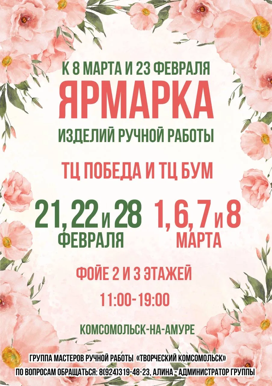 Приглашаем жителей и гостей Комсомольска-на-Амуре на ЯРМАРКУ изделий ручной работы в ТЦ Победа и ТЦ Бум, где вас будут ждать необычные подарки, сувениры, угощения и, конечно же, праздничное настроение.