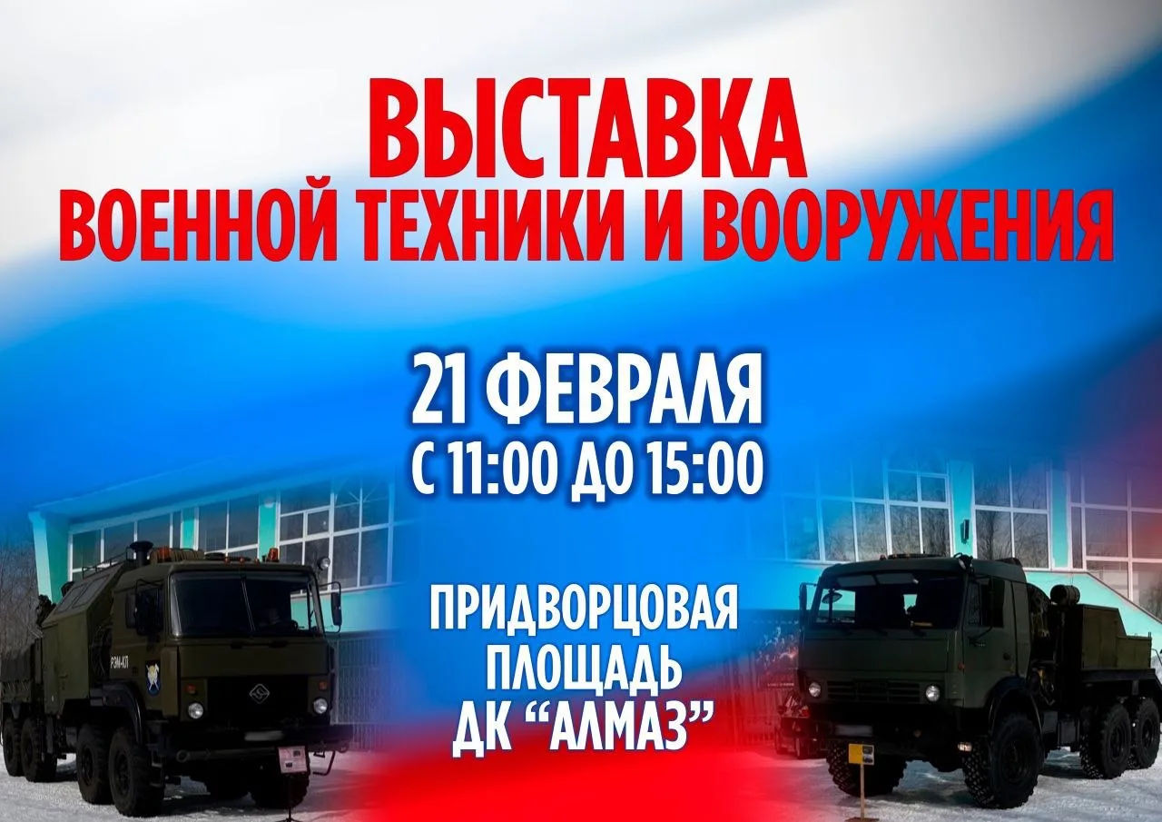 Одной строчкой: 21 февраля на площади ДК Алмаз к Дню Защитника Отечества состоится выставка специальной военной техники и вооружения.