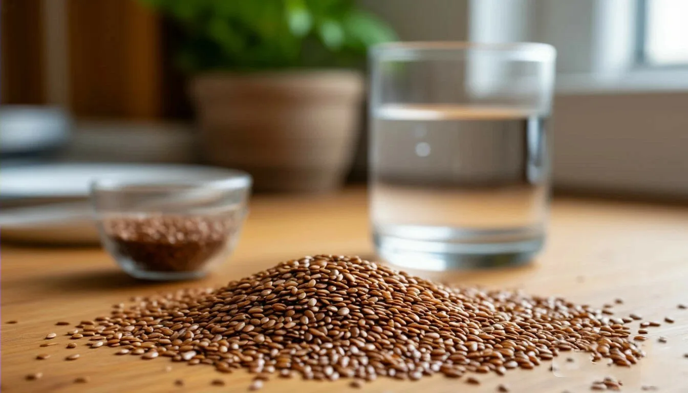 🌱 2. Утром натощак за 30 минут до еды съедайте чайную ложку семени льна, тщательно пережевывая, запивая тёплой водой — гладкая кожа и ровный цвет лица обеспечены.