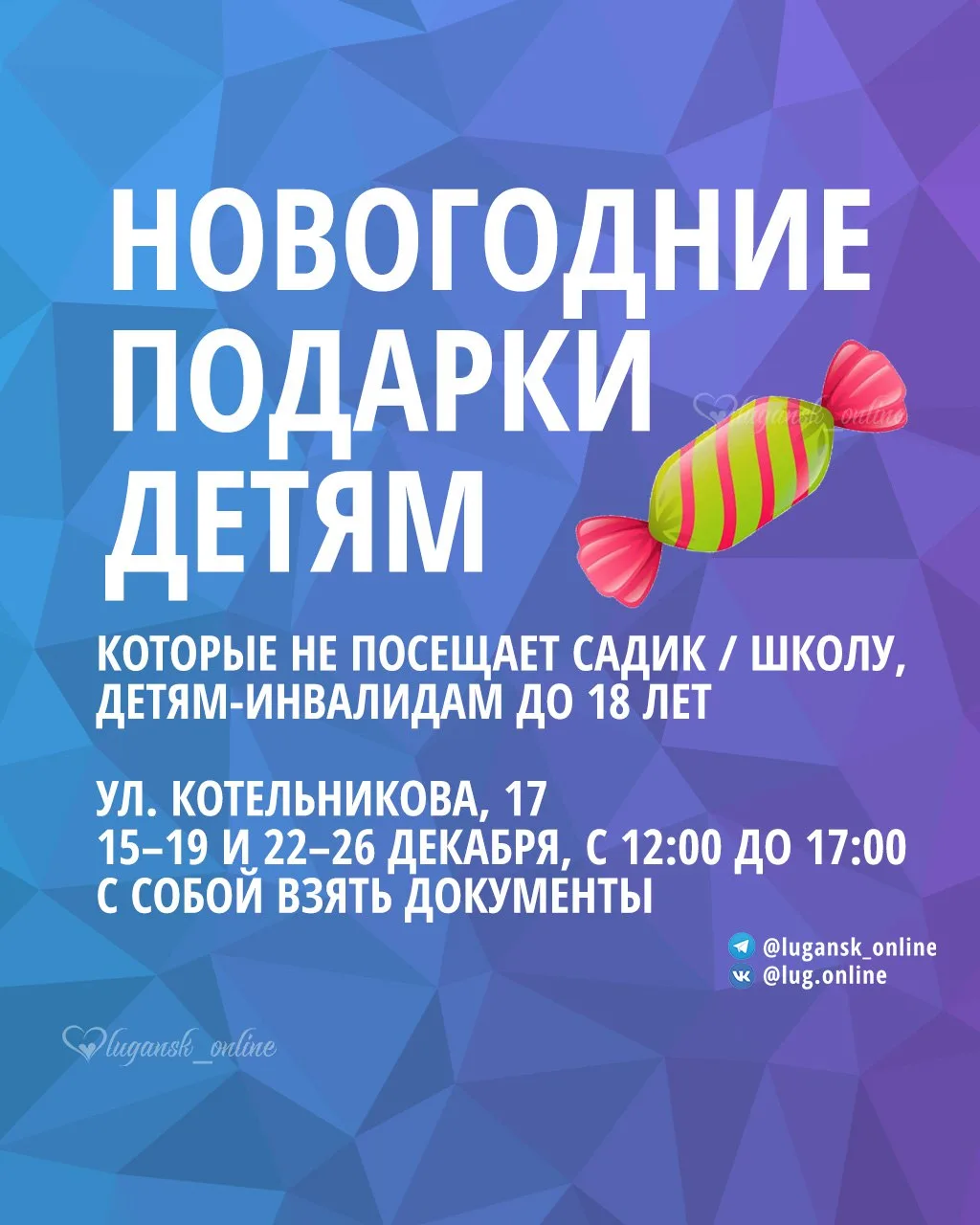 🍬Подарки дают тем, кто не посещает садик или школу, а также детям-инвалидам до 18 лет.