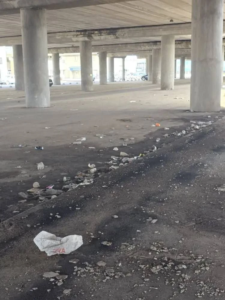 На фото парковка и спорт площадка под эстакадой
