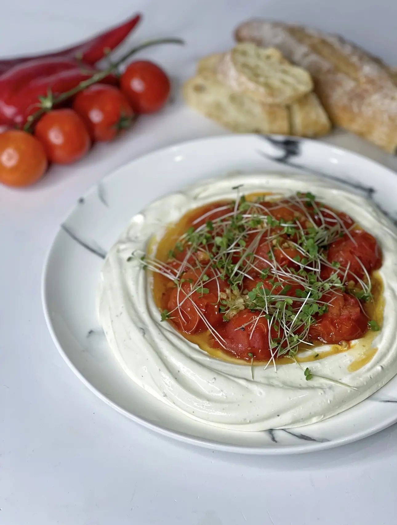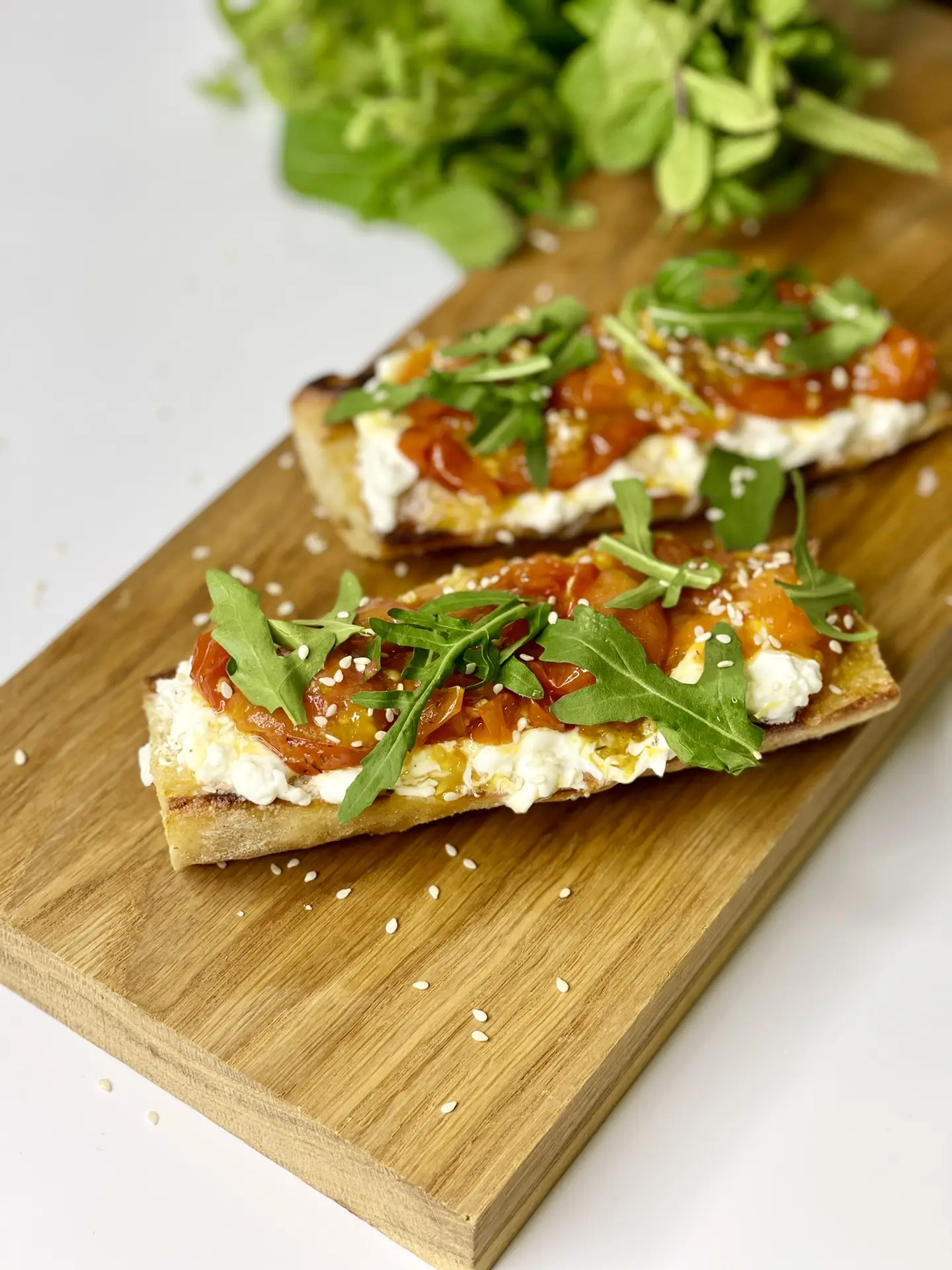хрустящей корочки, помидоры с чесноком и специями отправить в духовку на минут 10 при 200°, хлеб смазать чесноком, выложить сыр буратту, мягкие помидоры , посыпать рукколой и кунжутом.