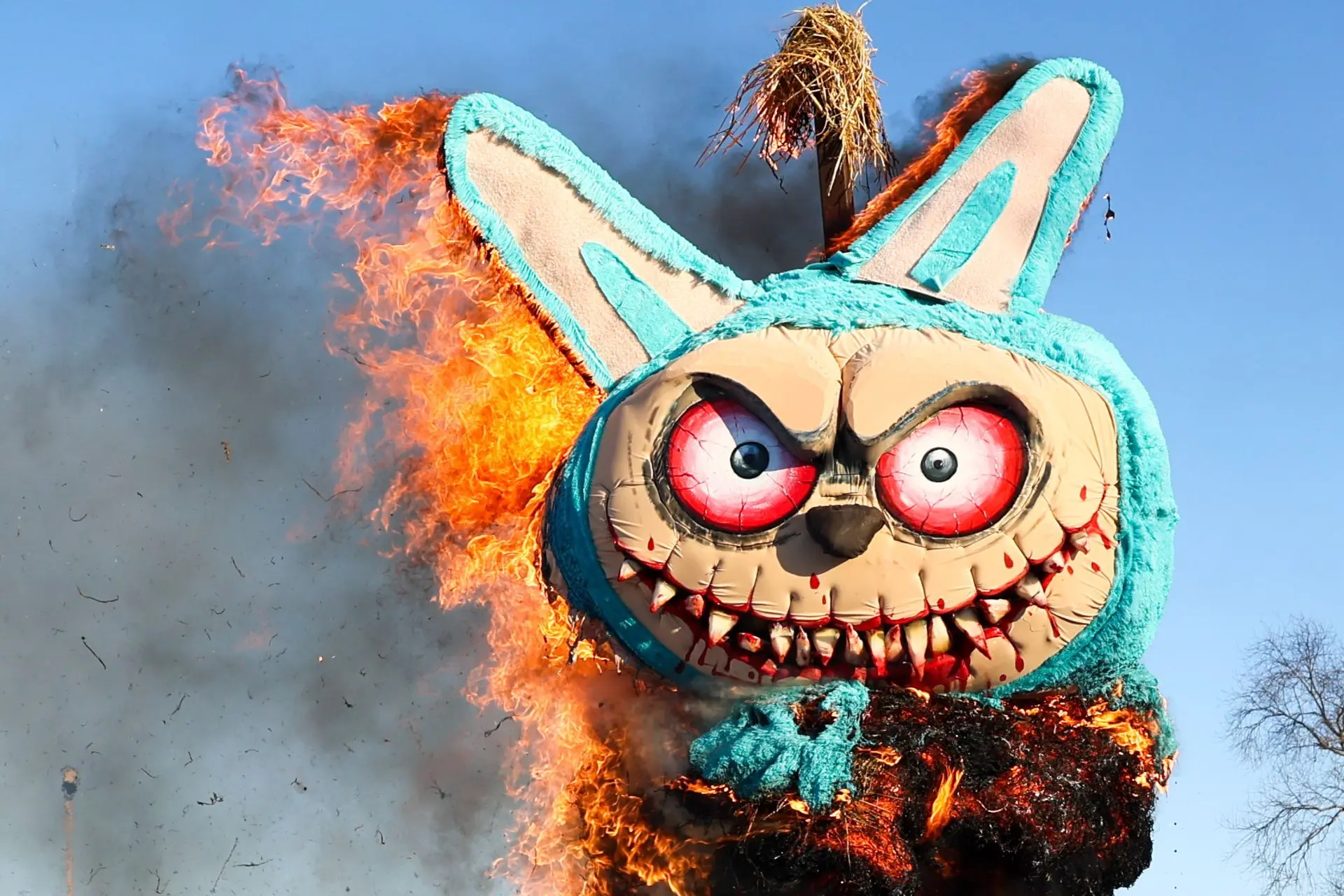 Трёхметровая игрушка сгорела и «очистила российскую культуру от всего чуждого», заявили организаторы.