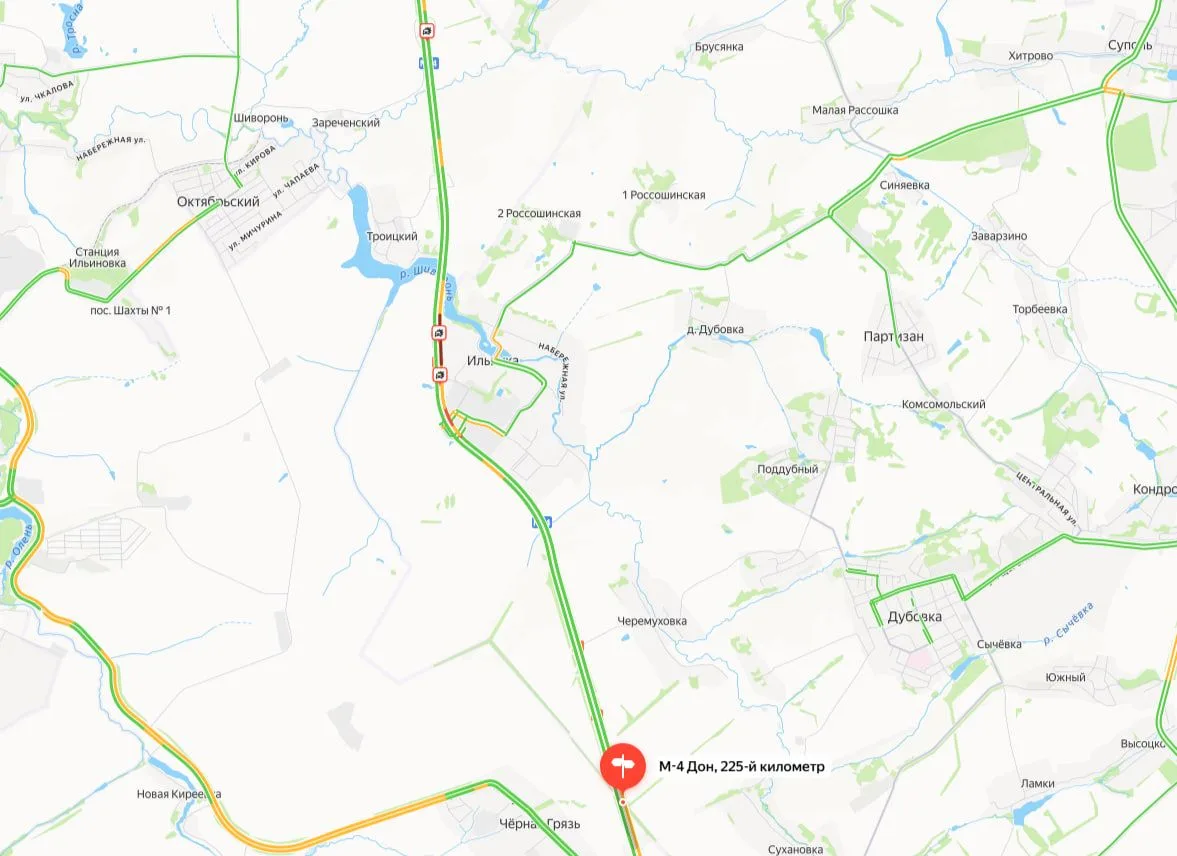 Серьёзный затор в сторону Ростова-на-Дону зафиксирован на федеральной трассе М-4 «Дон» в районе города Шахты. По предварительным данным, пробка начинается на 1006-м километре (территория Красюковского сельского поселения) и растянулась более чем на восемь километров — до поворота на хутор Сусол.