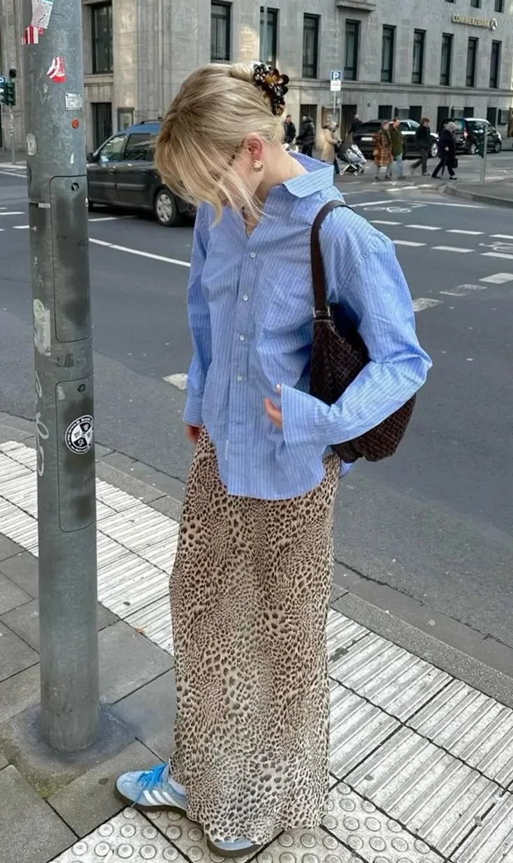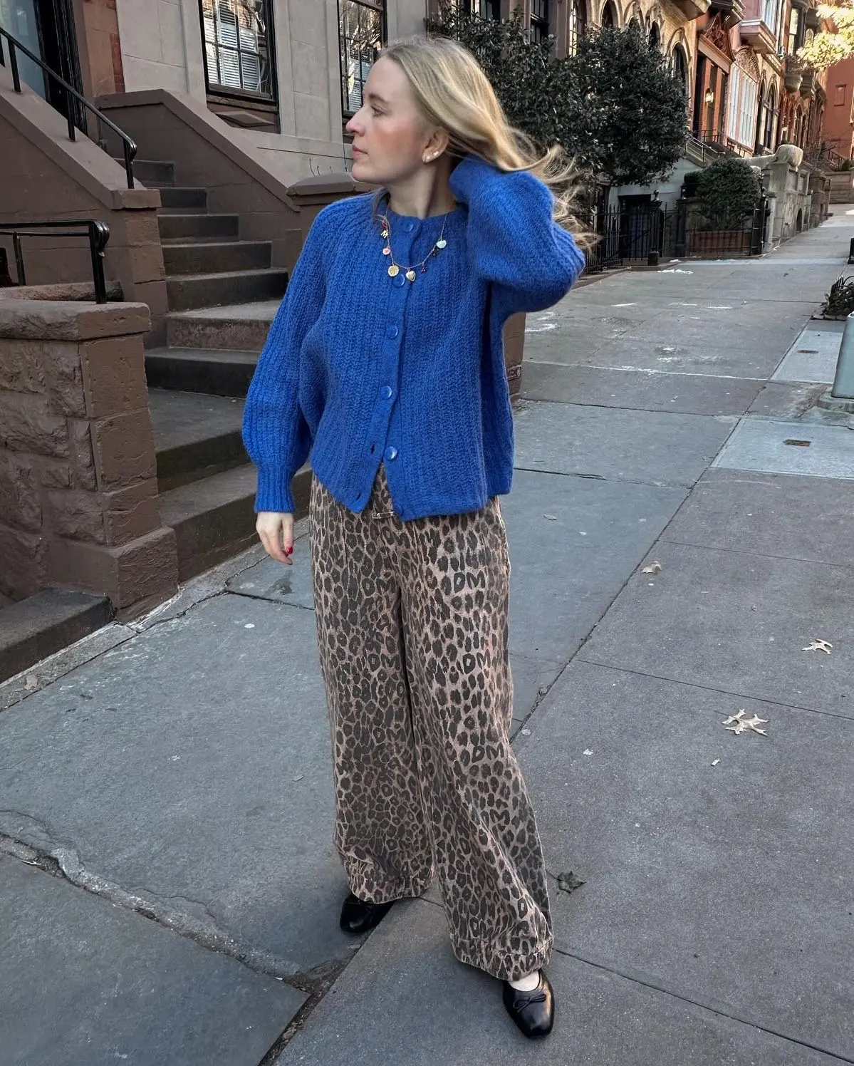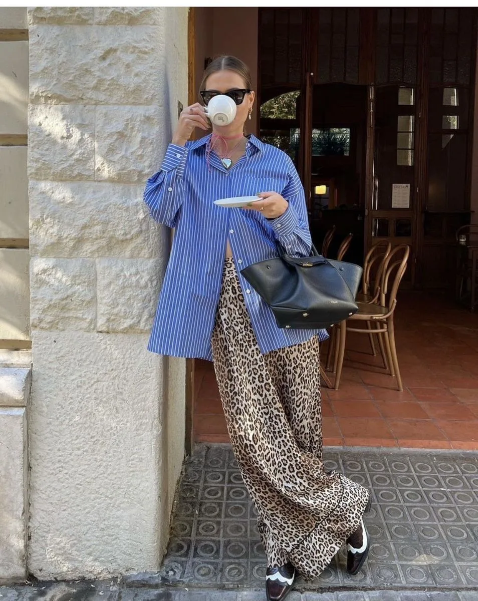 Самый простой способ освежить этот принт — добавить к нему голубой оттенок. И здесь происходит интересная трансформация: леопард сразу теряет свою агрессивность, становится более мягким, спокойным и даже визуально «дороже».