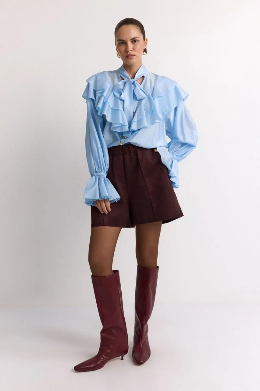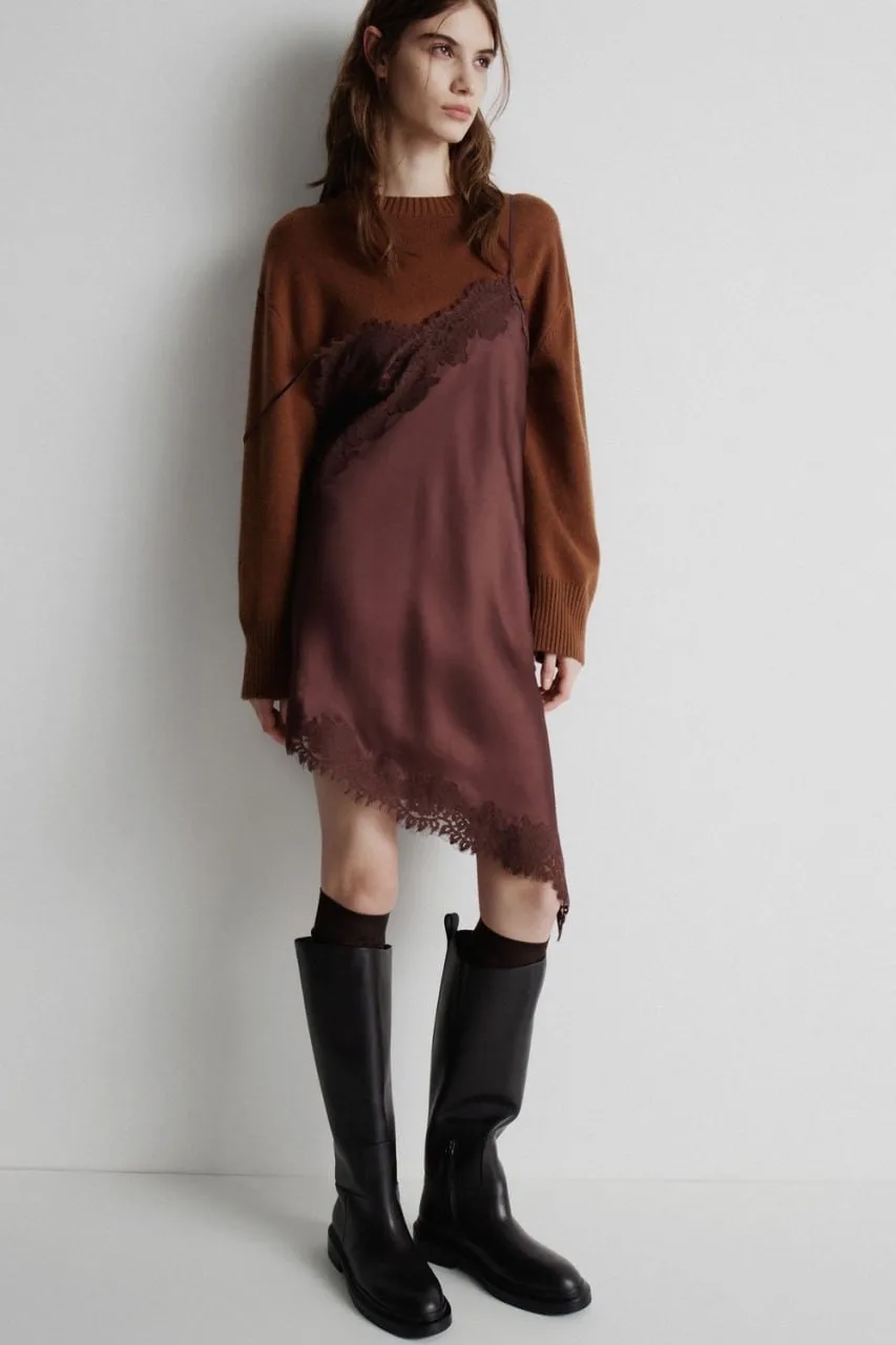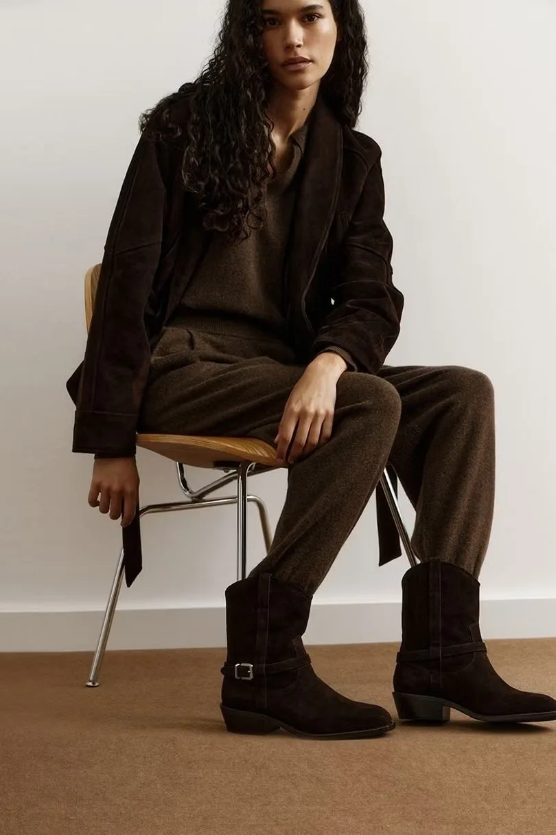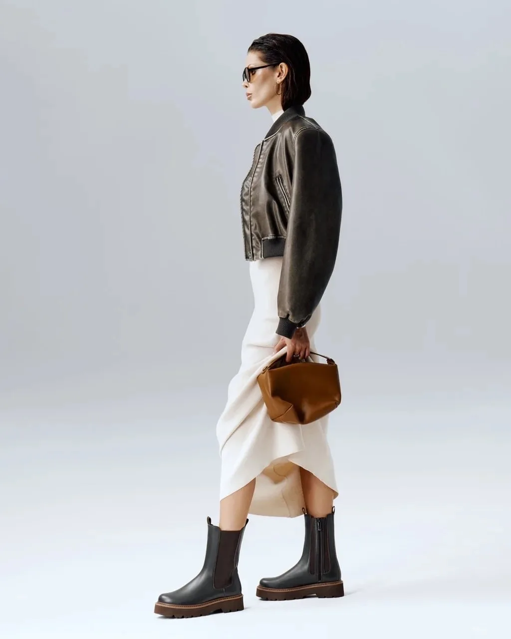 2. Сапоги лучше брать чуть свободнее, без эффекта «вторая кожа». Такое голенище выглядит современнее и легче стилизуется — и с юбкой, и с брюками, и потом весной можно продолжать носить, просто меняя сочетания.