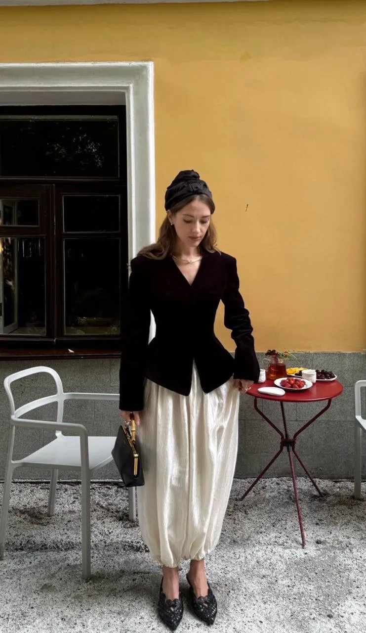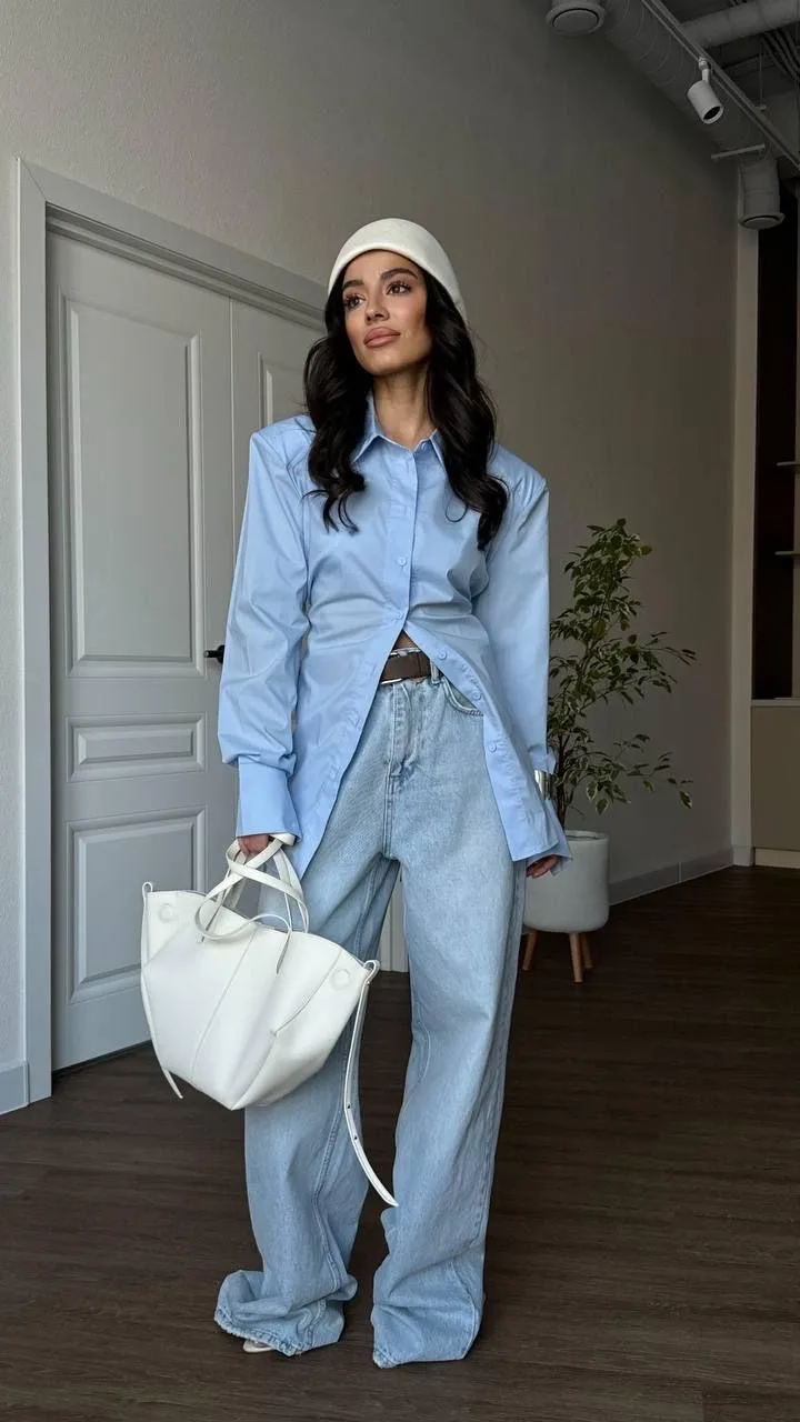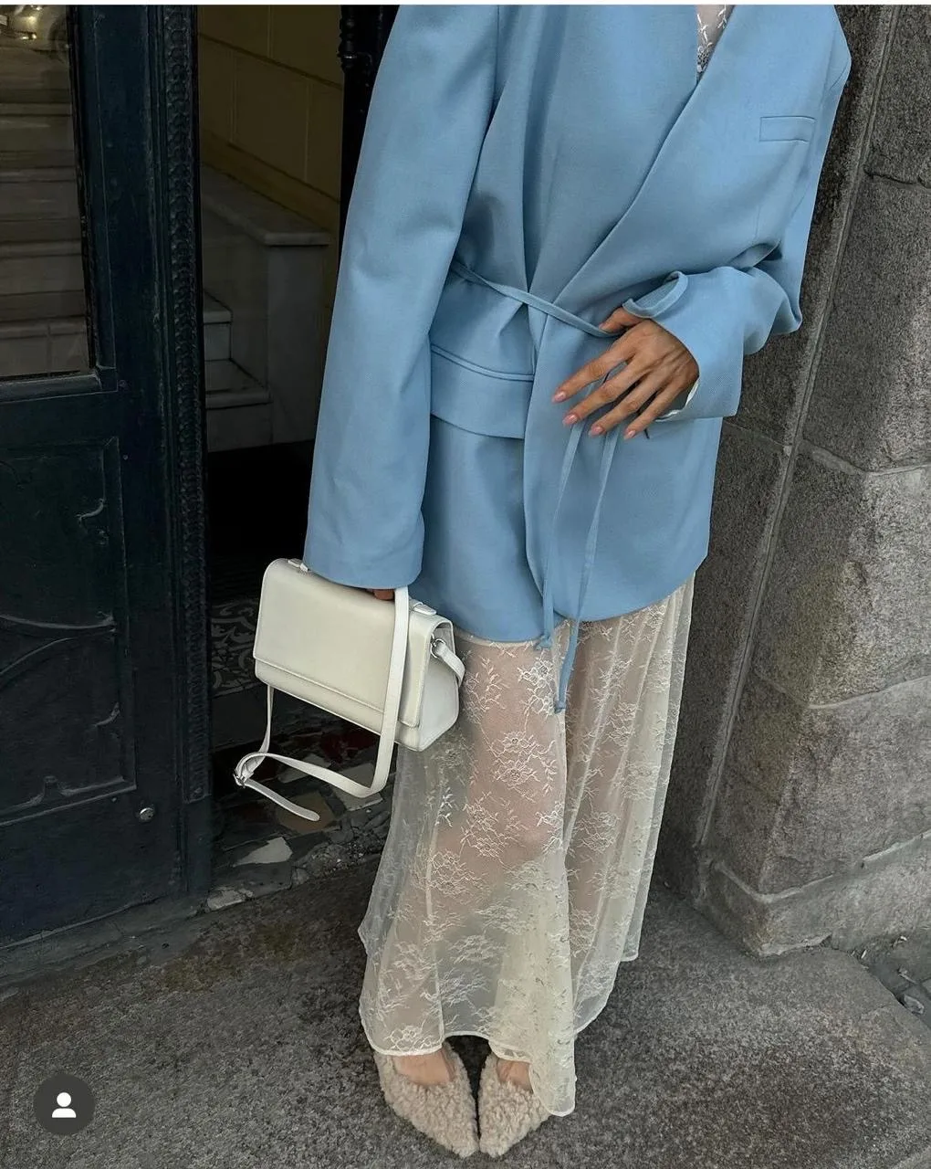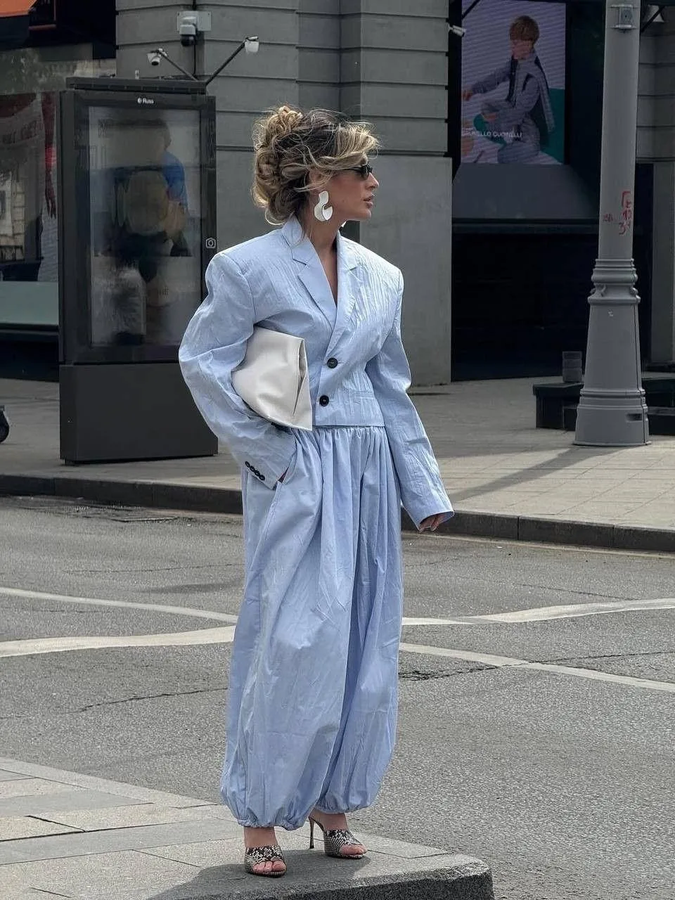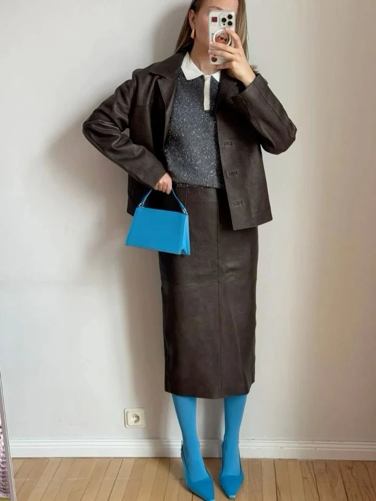 Причём не нужно усложнять — достаточно одной детали. Голубая рубашка, жакет или даже небольшая сумка уже меняют ощущение от всего образа. И вместо привычной драматичности вы получаете лёгкость и ту самую современную подачу, которая сейчас особенно ценится.