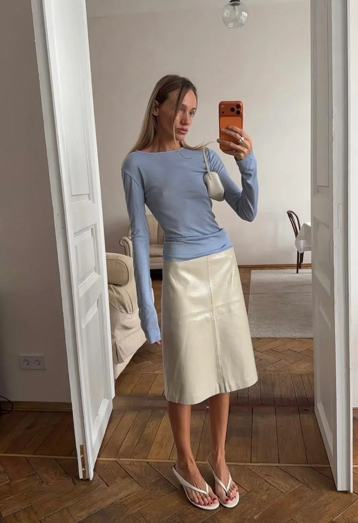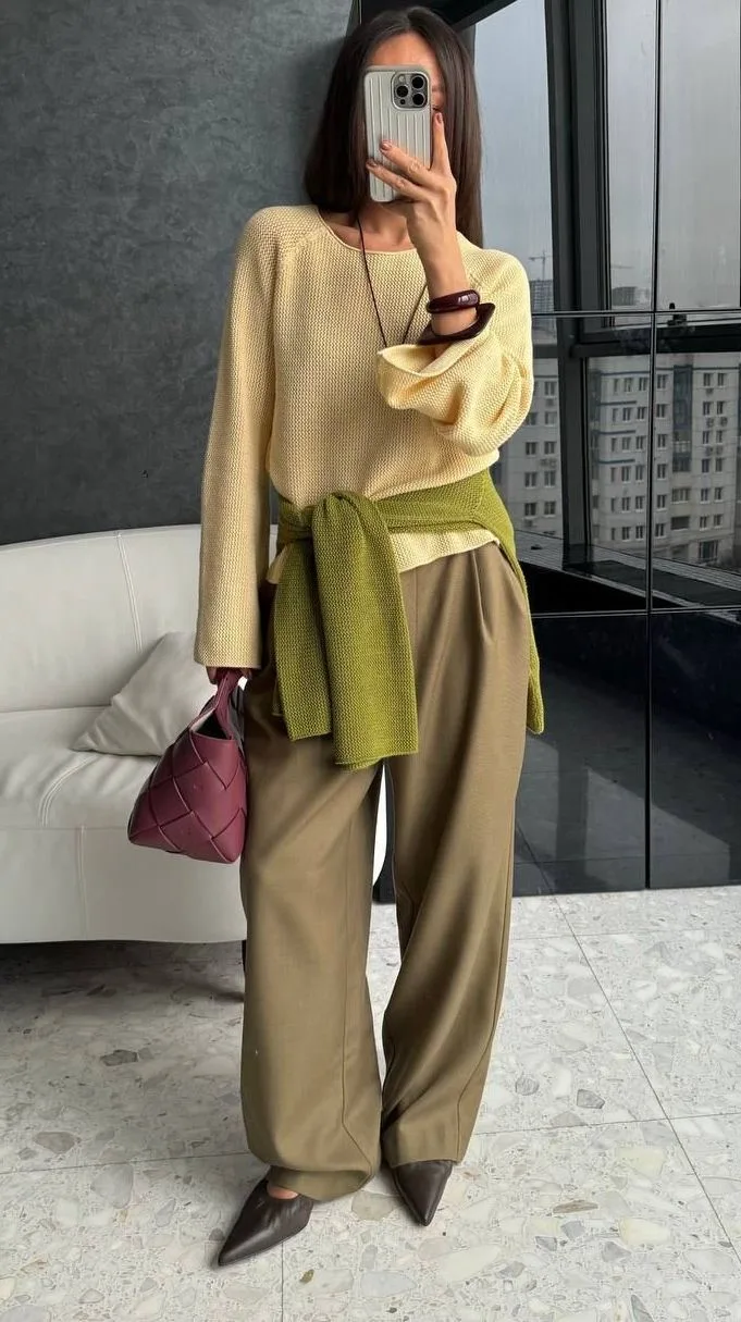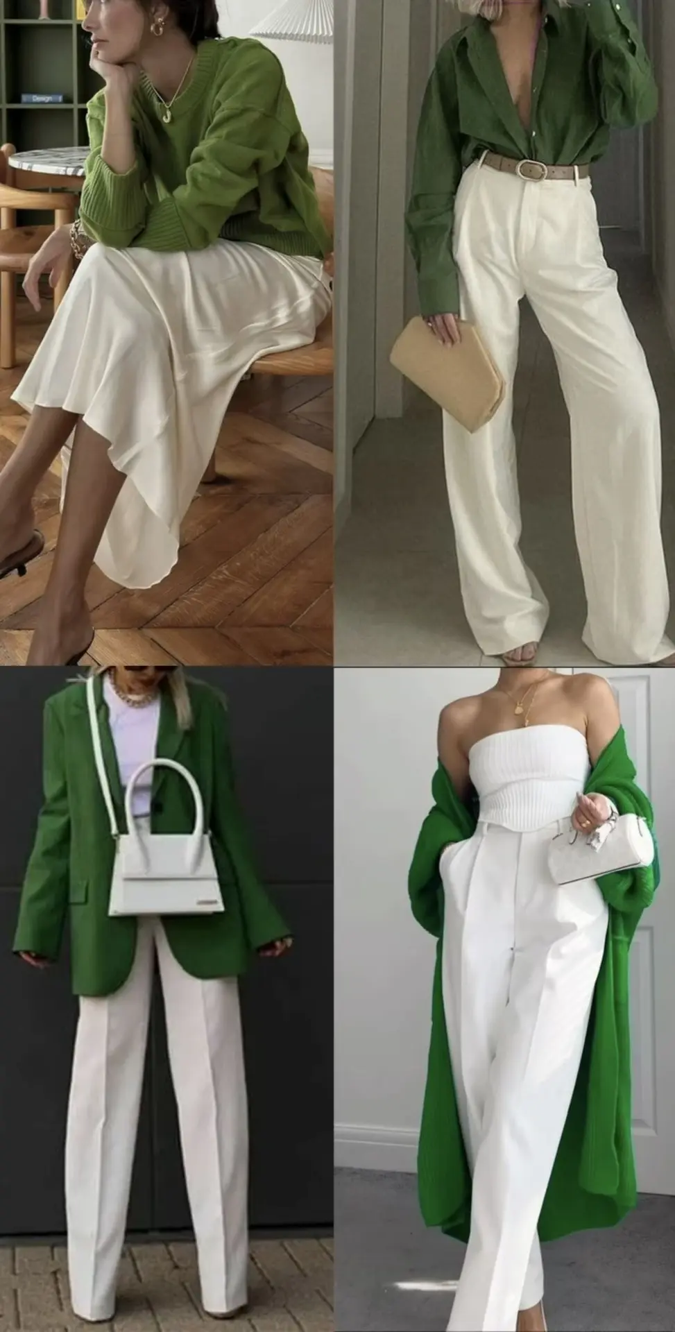 В 2026 его особенно интересно раскрывать через сочетания. Например, с белым — получается чисто и спокойно, с бежевым — максимально деликатно и дорого, а если добавить серый или деним, образ становится более современным и собранным. Для смелых — попробуйте фисташку с контрастными акцентами, и тогда он заиграет совсем по-новому.