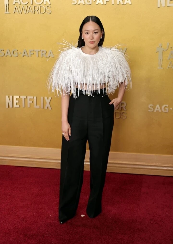 Йерин Ха в Balenciaga— перья создают сильную горизонталь в зоне плеч, брюки добавляют жёсткость снизу. Талия исчезает, фигура становится прямоугольной. Это красивый редакционный образ, но камера на ковре усиливает дисбаланс.