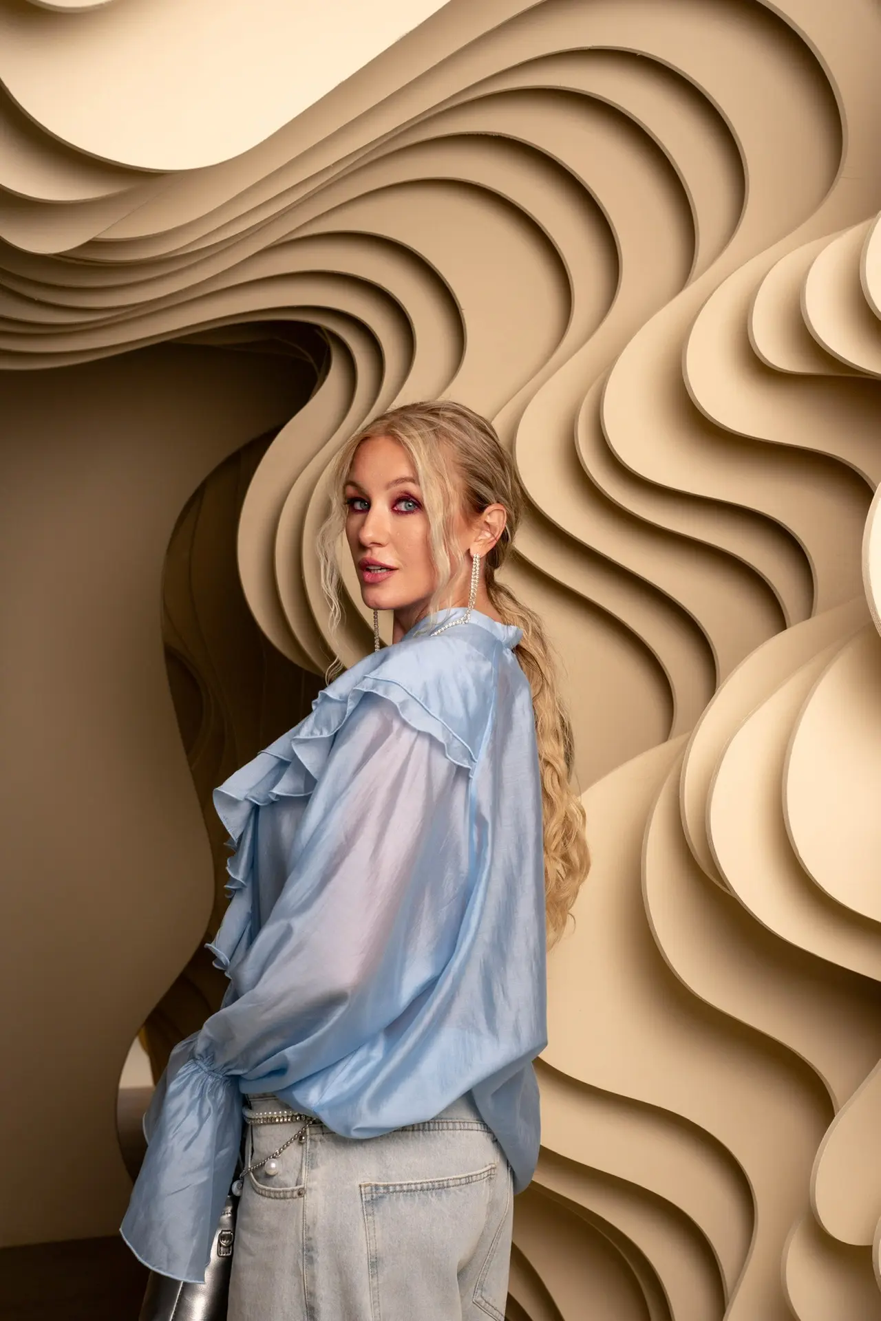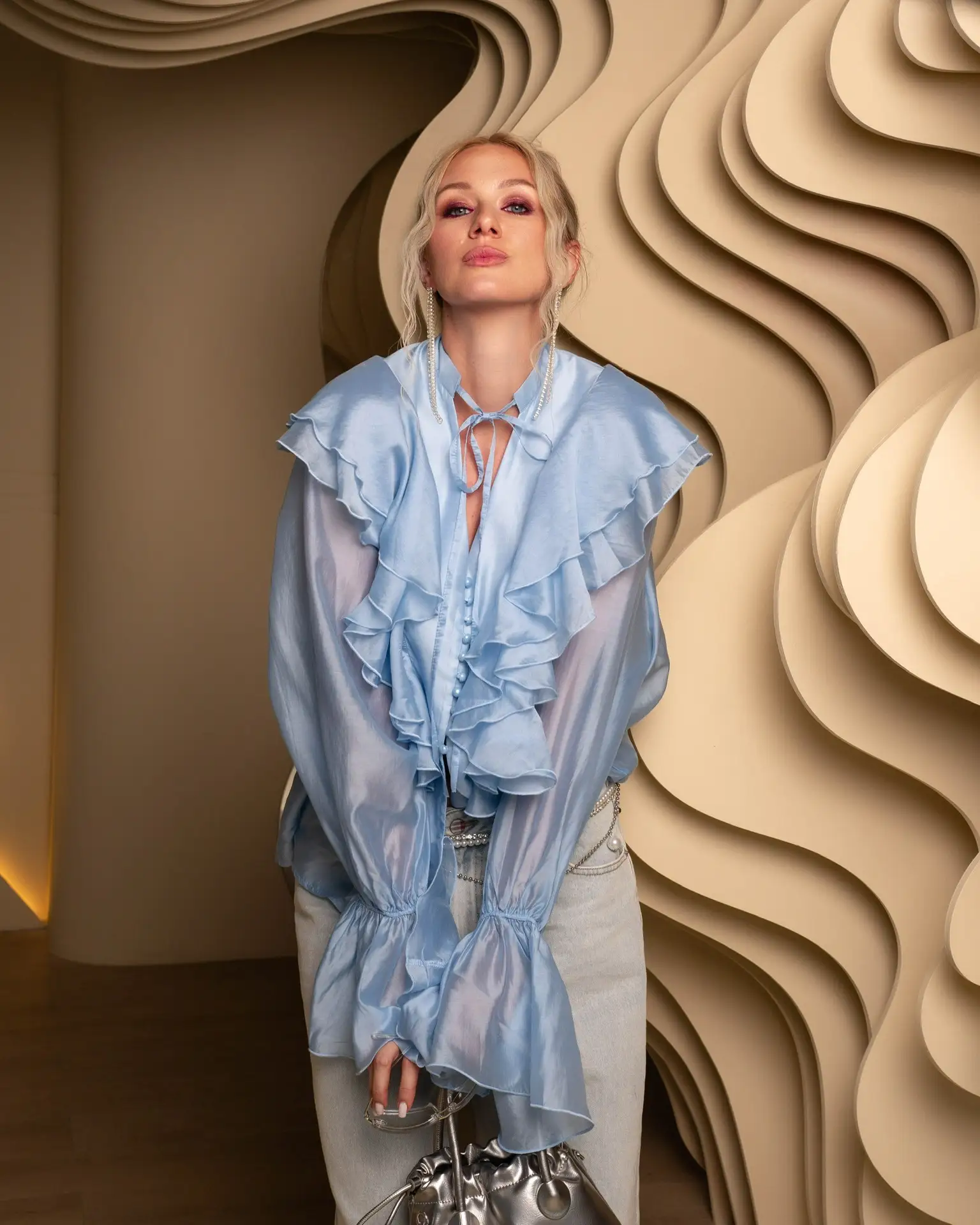 Анастасия Федько в платье российского дизайнера — пример того, как объём может выйти из-под контроля. Корсет, баска, массивная юбка — три уровня расширения. Баска визуально расширяет бёдра, тюль добавляет мягкий, неструктурированный объём. В итоге платье становится больше, чем сама Анастасия.
